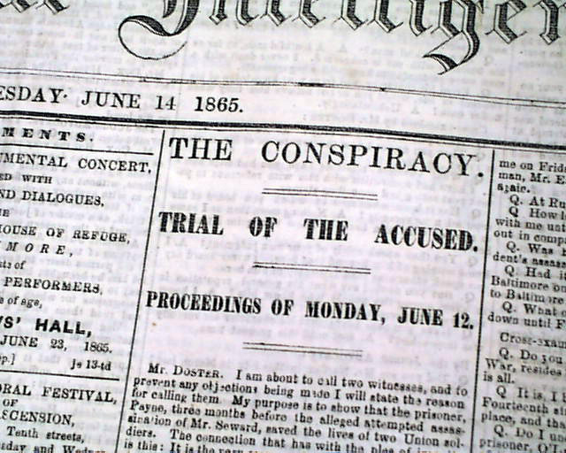 The top of the front page has: "THE CONSPIRACY" "TRIAL OF THE ACCUSED" "Proceedings Of Monday, June 12". Three columns are taken up with verbatim questions and answers.