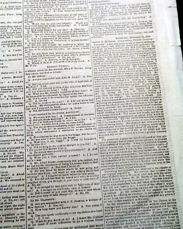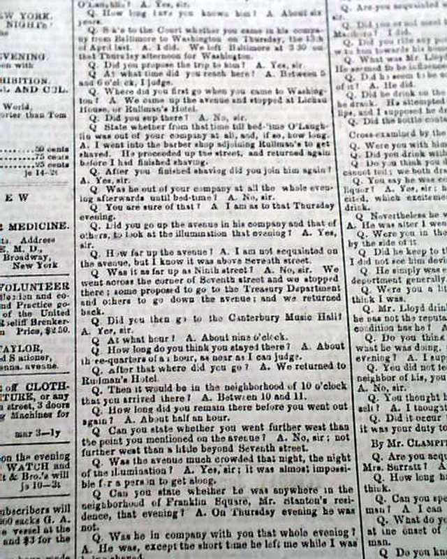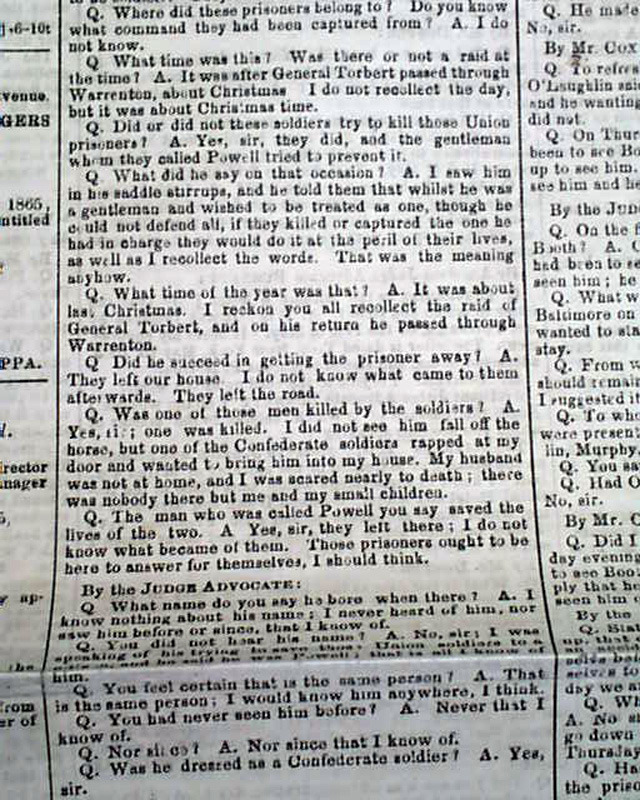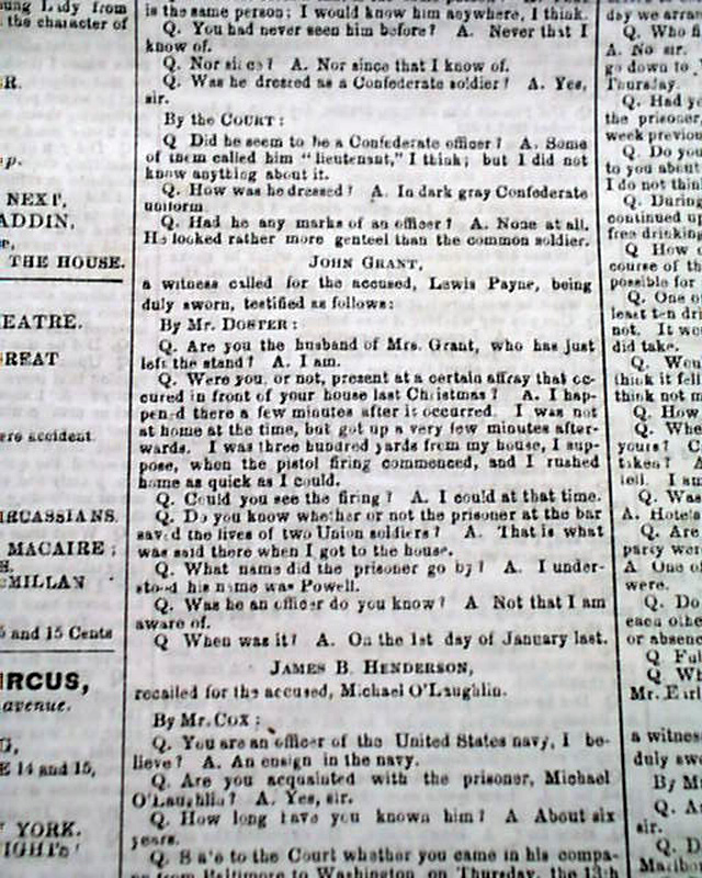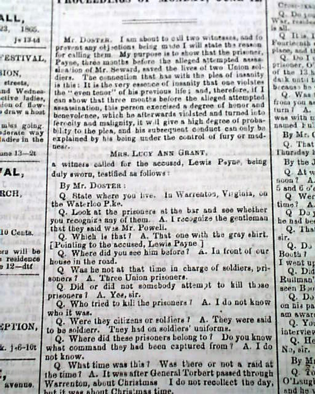 background: The June 14, 1865, edition of the Daily National Intelligencer serves as a chillingly precise legal ledger, capturing the raw tension of the military commission as it neared its final weeks. By dedicating nearly two full pages to verbatim testimony from the June 12 proceedings, the paper documented a pivotal shift in the trial where the prosecution sought to tighten the web around the surviving conspirators, specifically focusing on the movements of Lewis Powell (alias Payne) and the logistical support provided by Mary Surratt's boarding house. The three-column format, devoid of modern editorializing, reveals the meticulous—and often grueling—nature of 19th-century cross-examination, where witnesses were pressed on minute details regarding the transport of carbines, the "theatrical" movements of John Wilkes Booth, and the alleged involvement of the Confederate leadership in Richmond. This specific issue represents a transition from the shock of the assassination to the cold, bureaucratic delivery of justice, preserved on high-quality rag paper that allowed such a dense record of the "Crime of the Century" to survive into the modern era.