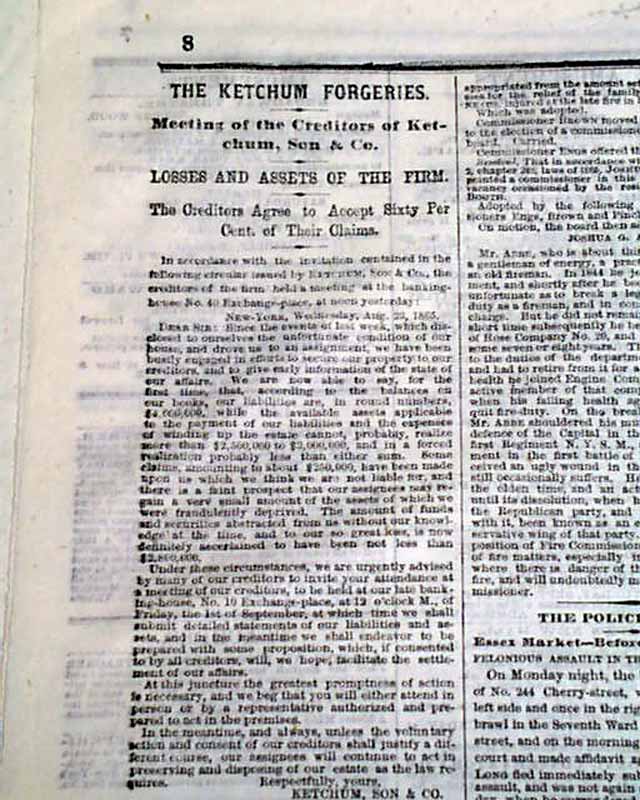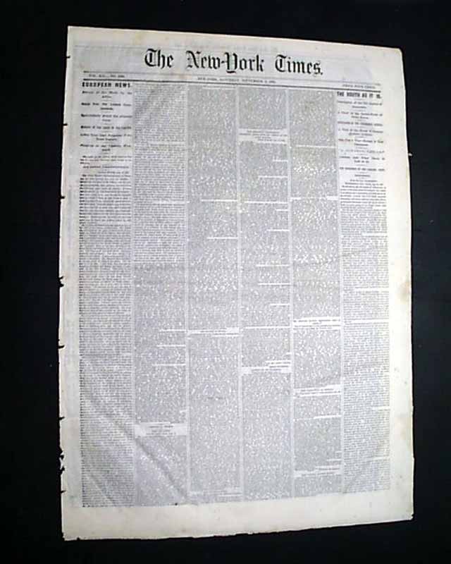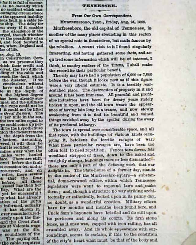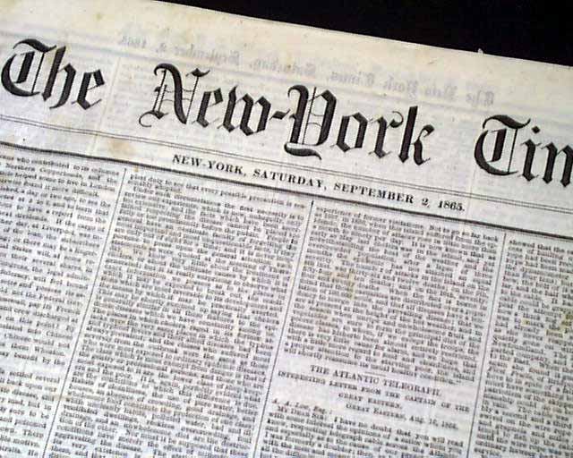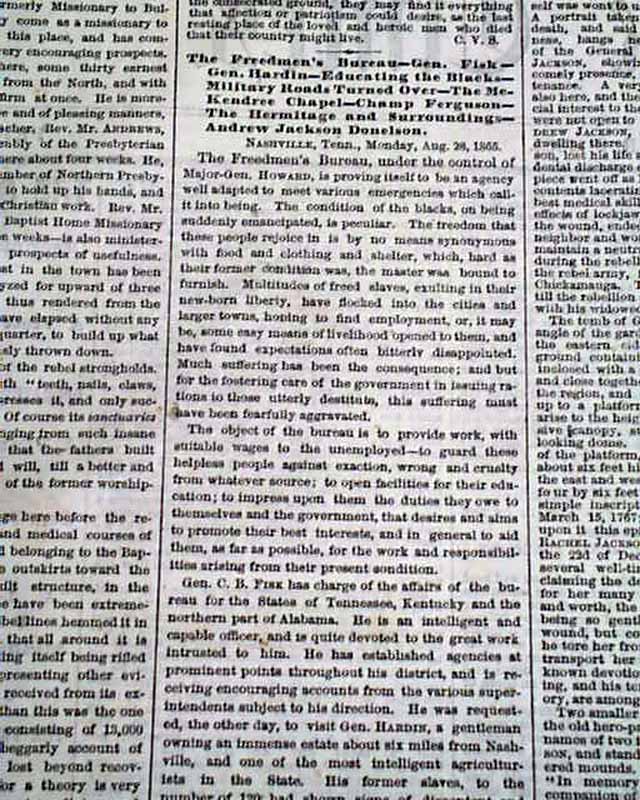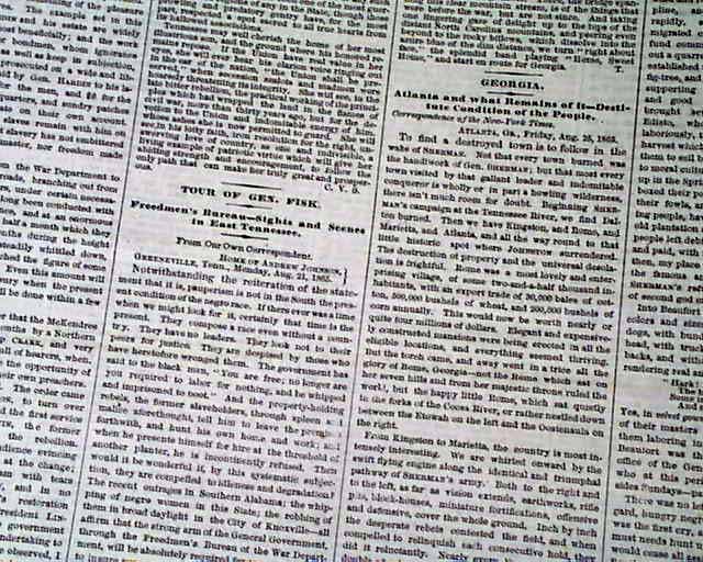 NEW YORK TIMES, Sept. 2, 1865  Much reporting on Reconstruction efforts in the South. The front page has: "THE SOUTH AS IT IS" "A View of the Battle-Field of Stone River" "Operations of the Freedmen's Bureau" "Visit to the Home of General Andrew Jackson" "Atlanta & What There is Left of It".