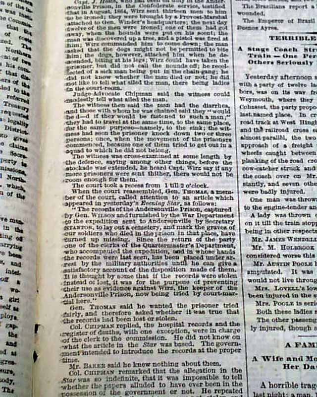 Page 5 has: "The Trial of Capt. Wirz" Further Testimony as to Hunting Men With Bloodhounds & Other Harsh Treatment--The Records of Andersonville Prison not Stolen...".