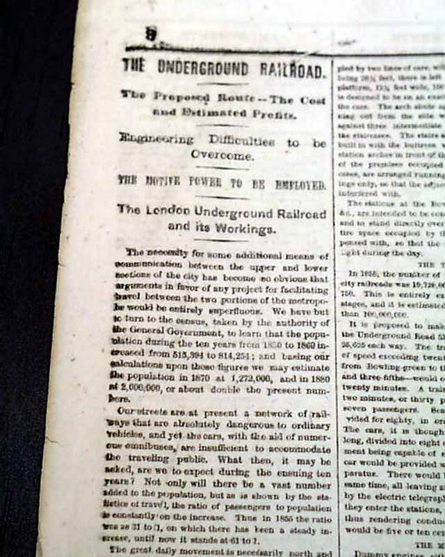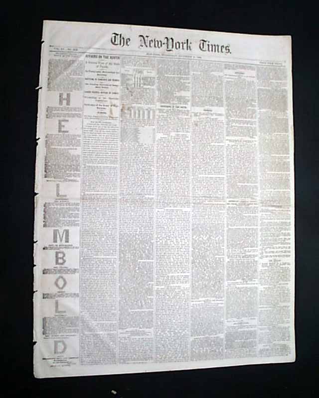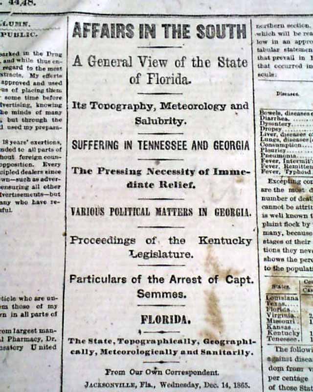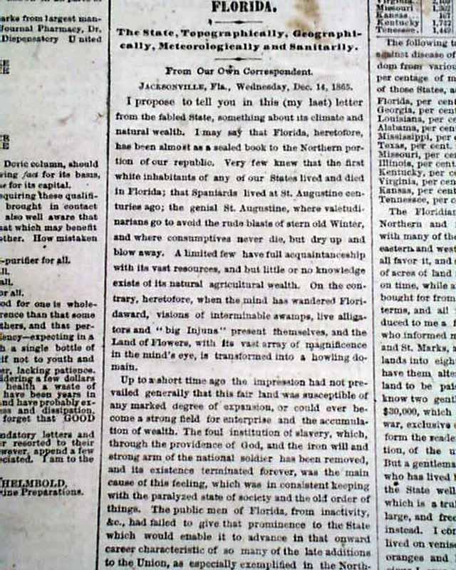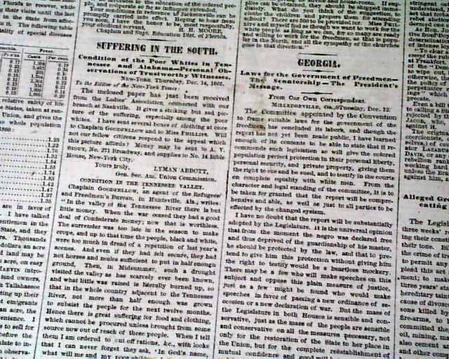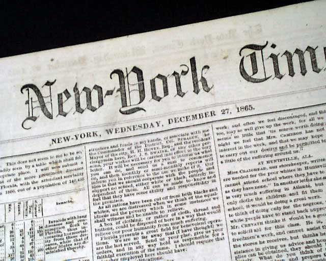 NEW YORK TIMES, Dec. 27, 1865  The front page has some reports on Reconstruction efforts after the Civil War, with column heads including: "AFFAIRS IN THE SOUTH" "A General View of the State of Florida" "It's Topography, Meteorology &  Salubrity" "Suffering In Tennessee and Georgia" "Pressing Necessity of Immediate Relief" "Various Political Matters In Georgia" "Proceedings of the Kentucky Legislature" "Suffering in the South" "Georgia" and more.