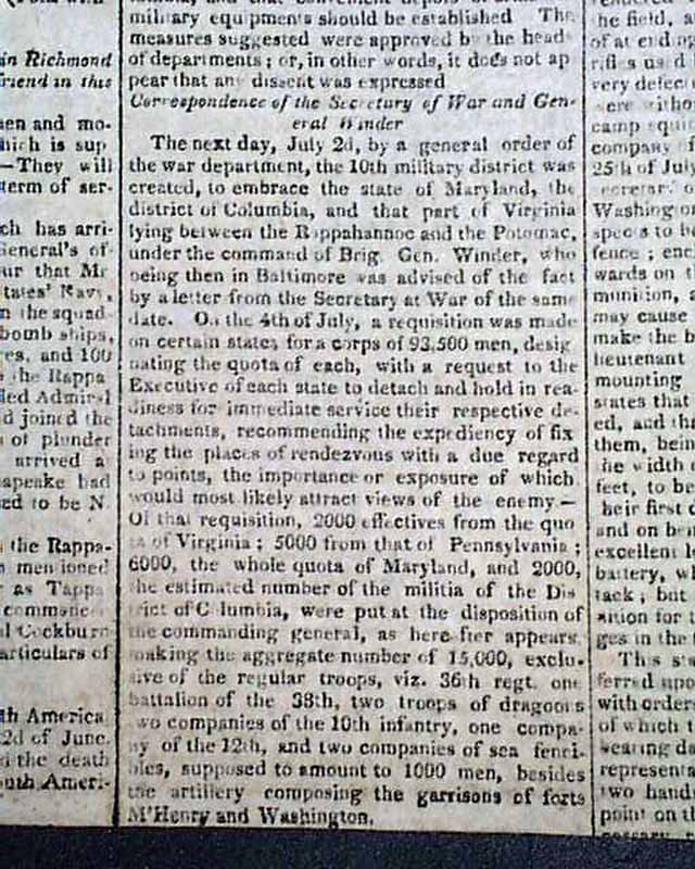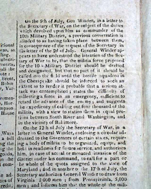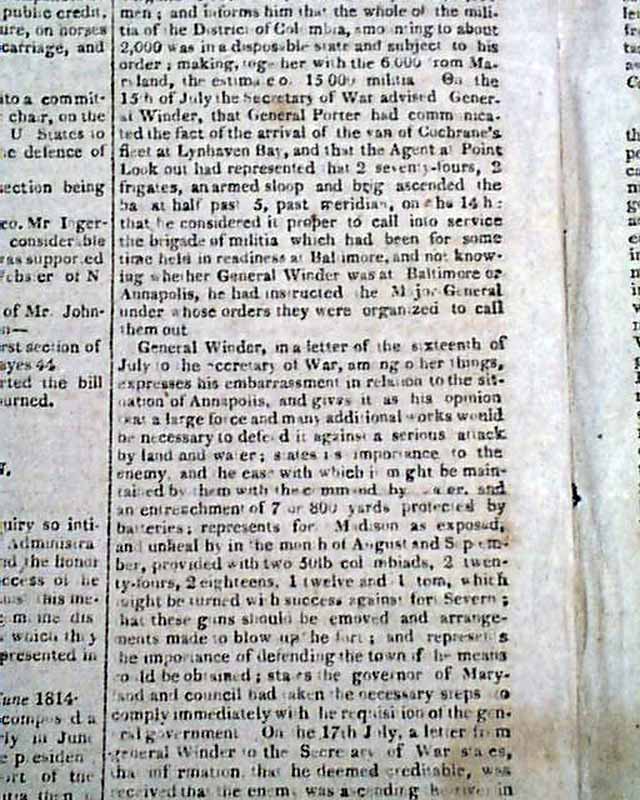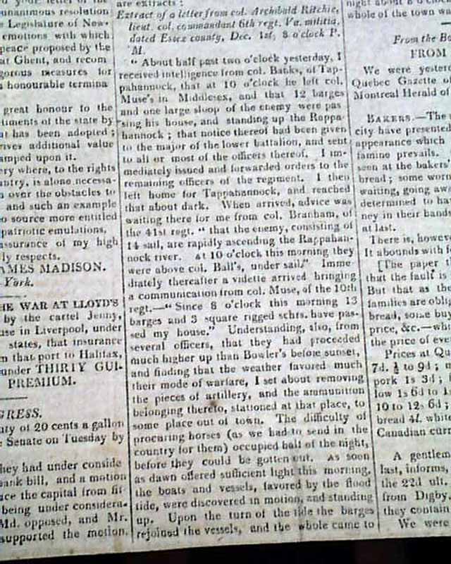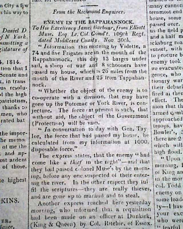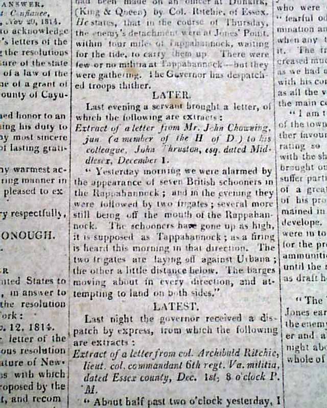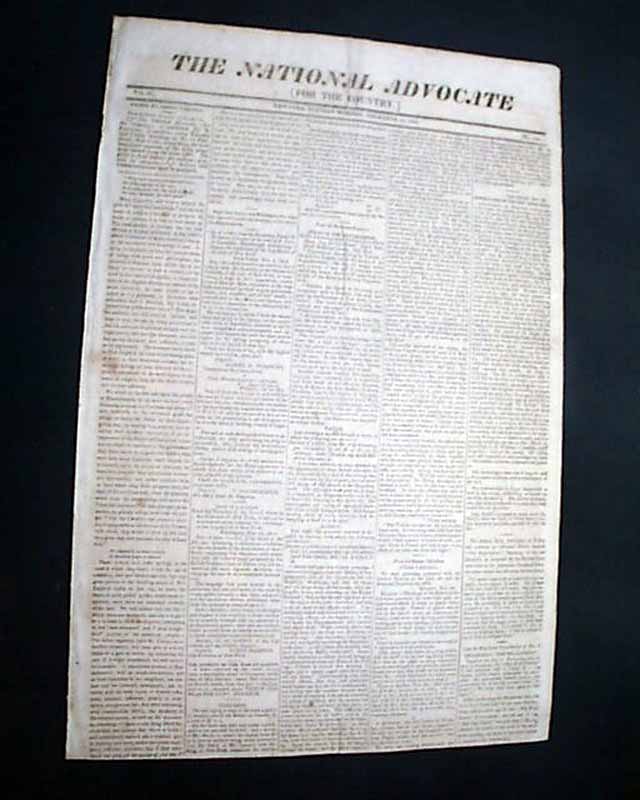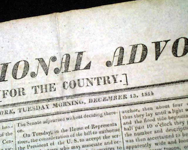 THE NATIONAL ADVOCATE, New York, Dec. 13, 1814  This issue has reports on the closing, climatic months of the War of 1812.