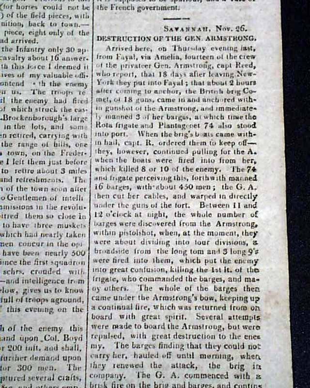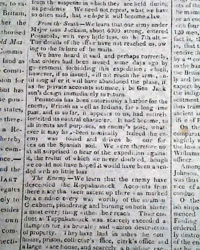 Content includes several reports "From the South" on the actions of General Andrew Jackson around Pensacola; "Privateer General Armstrong" which takes over a full column; "Correspondence of the Secretary of War & General Winder" which takes over a full column, plus other war-related content.