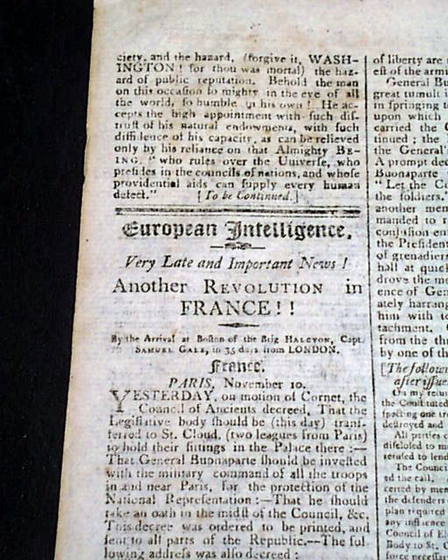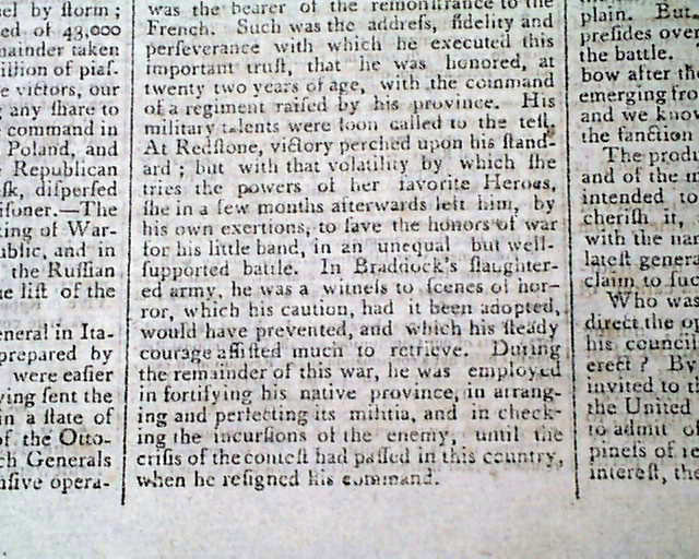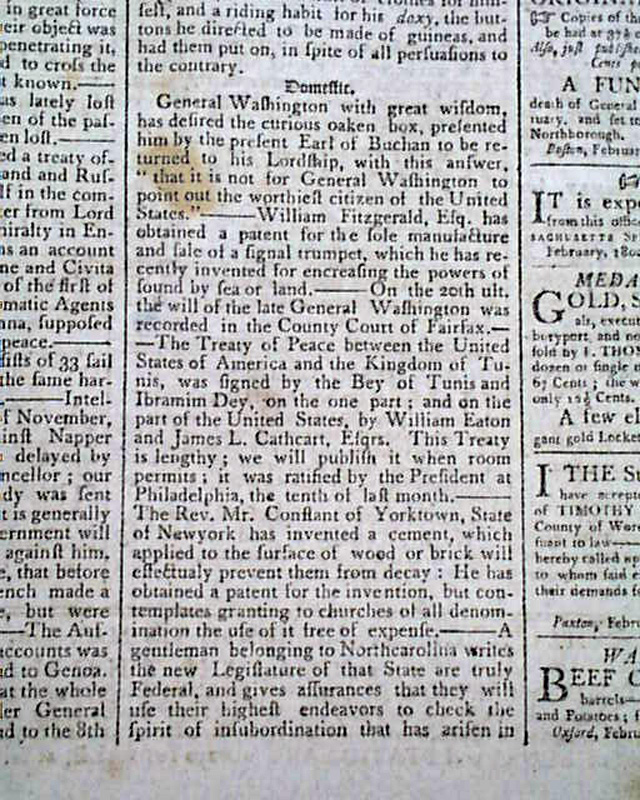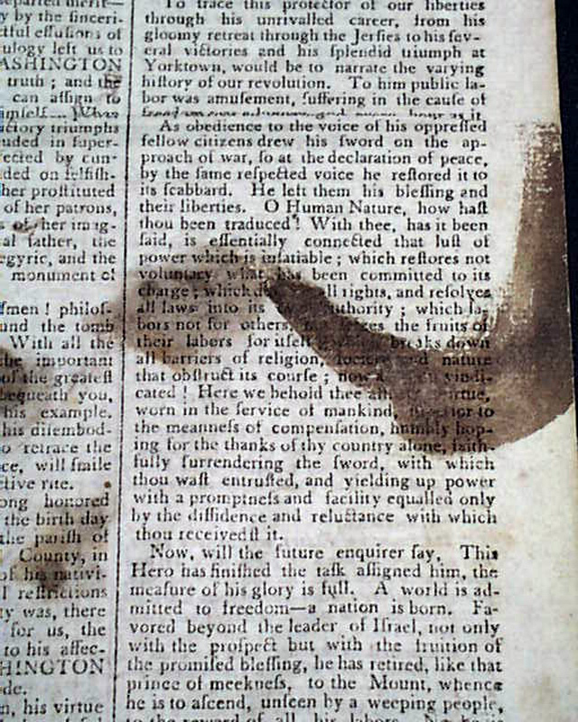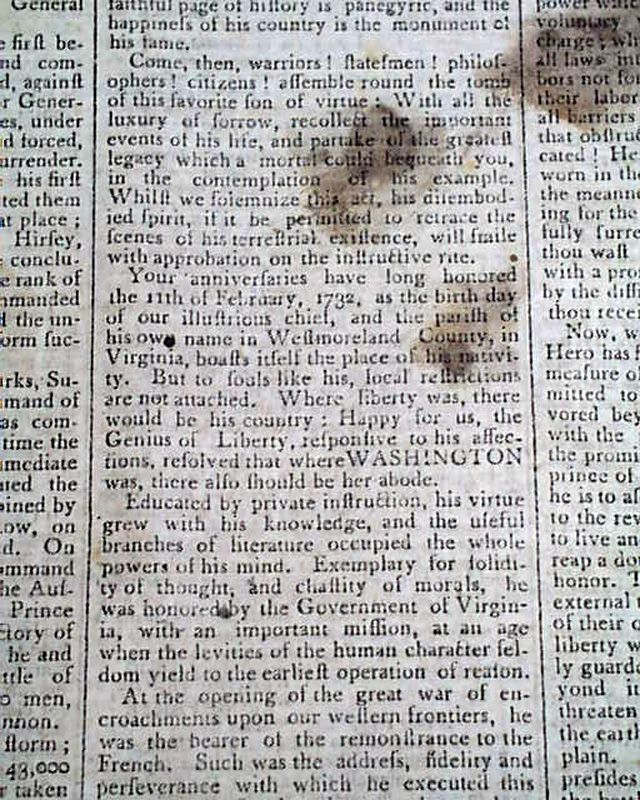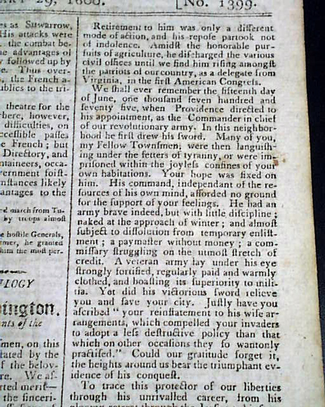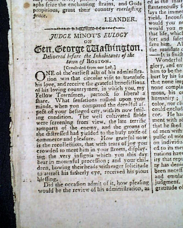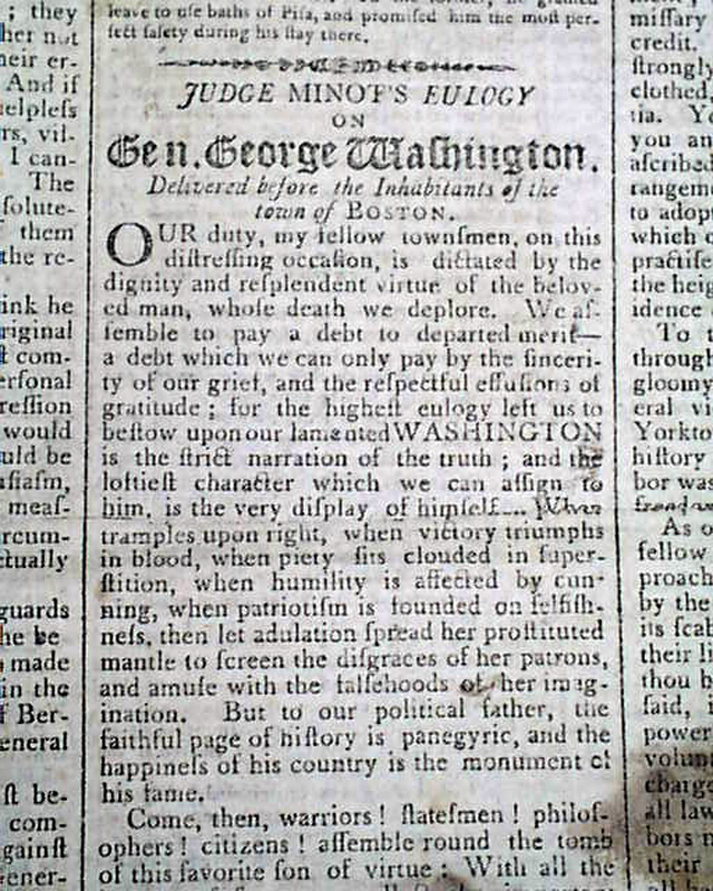 The front page of Jan. 29 has nearly two column taken up with: "Judge Minot's Eulogy On Gen. George Washington, Delivered before the Inhabitants of the town of Boston" which continues to page 2, then concludes by taking over two-thirds of the front page of the Feb. 5 issue.