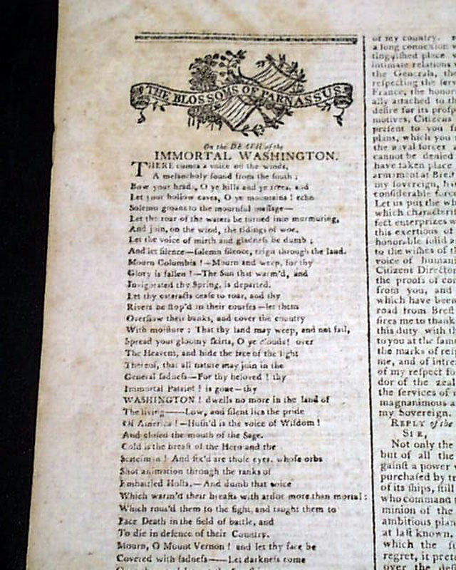 Page 3 of Jan. 29 has an item from Boston on the appointment of John Davis to deliver a eulogy: "...on the character of the late General WASHINGTON before the Society...", and the back page has a half column poem: "On the Death of the Immortal Wahington".