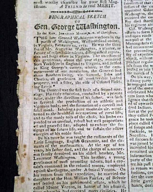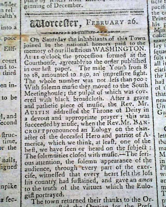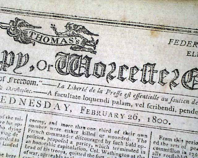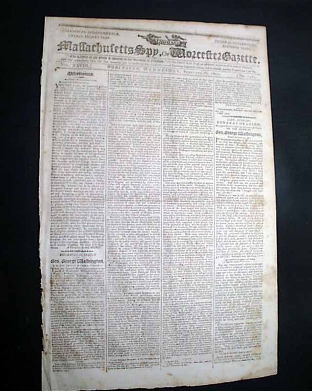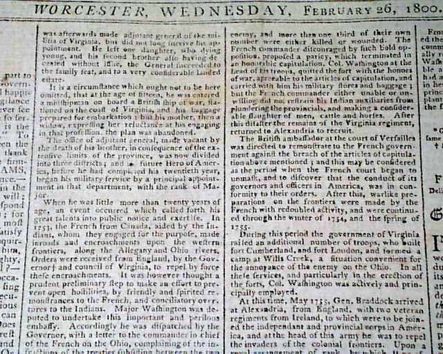 THOMAS'S MASSACHUSETTS SPY OR WORCESTER GAZETTE, Feb. 26, 1800 Over half of the front page is taken up with: "Biographical Sketch of Gen. George Washington" providing much detail on his early life. The article is continued in a future issue.