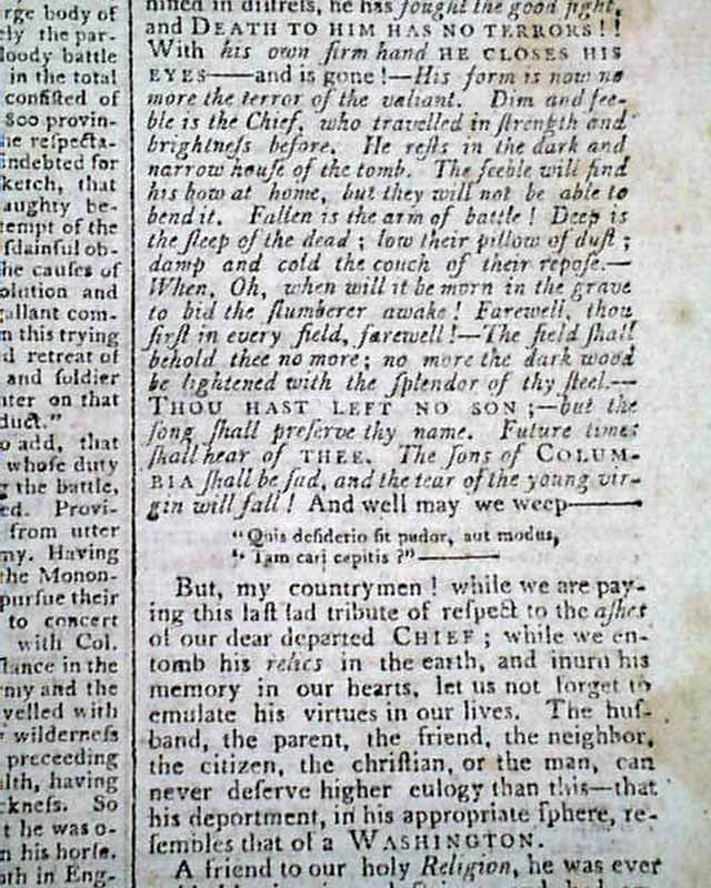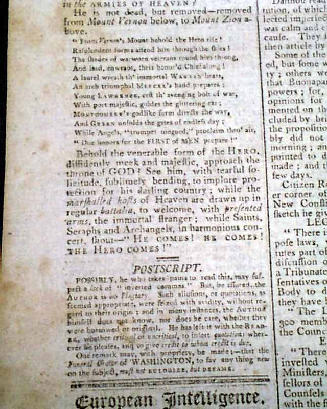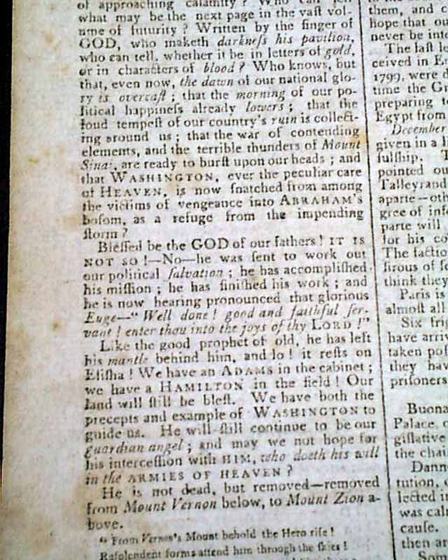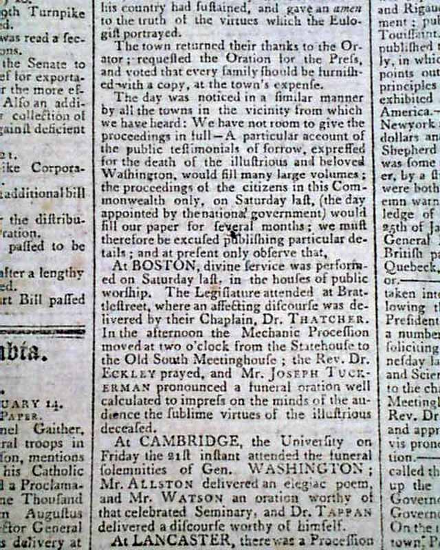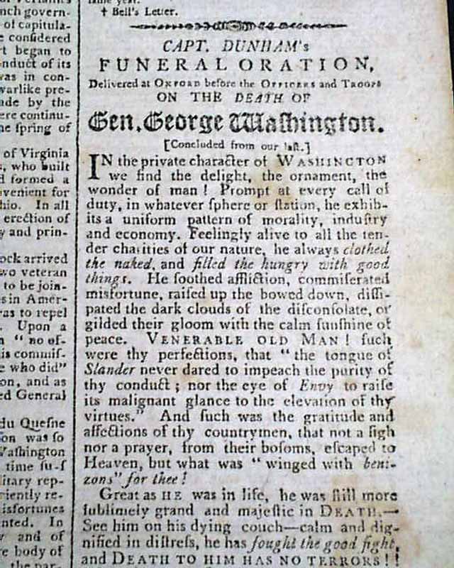The last column of page 1 is mostly taken up with: "Capt. Dunham's Funeral Oration...On the Death of Gen. George Washington" which concludes from a previous issue & includes mention of his Masonic involvement, carrying over to page 2. And page 3 has another report on honoring the death of Washington.