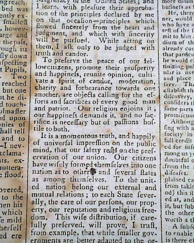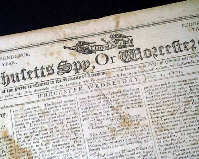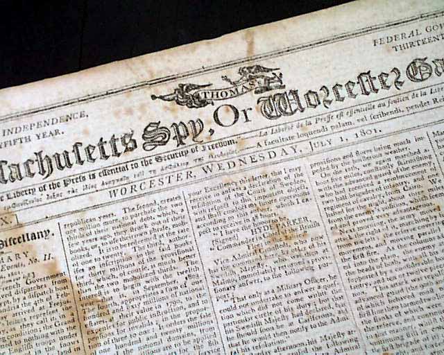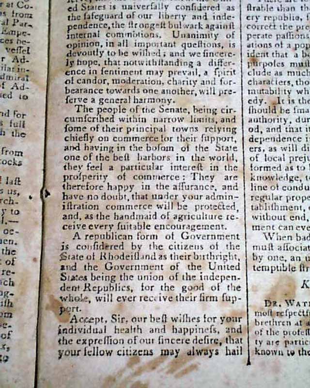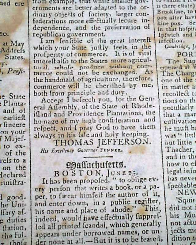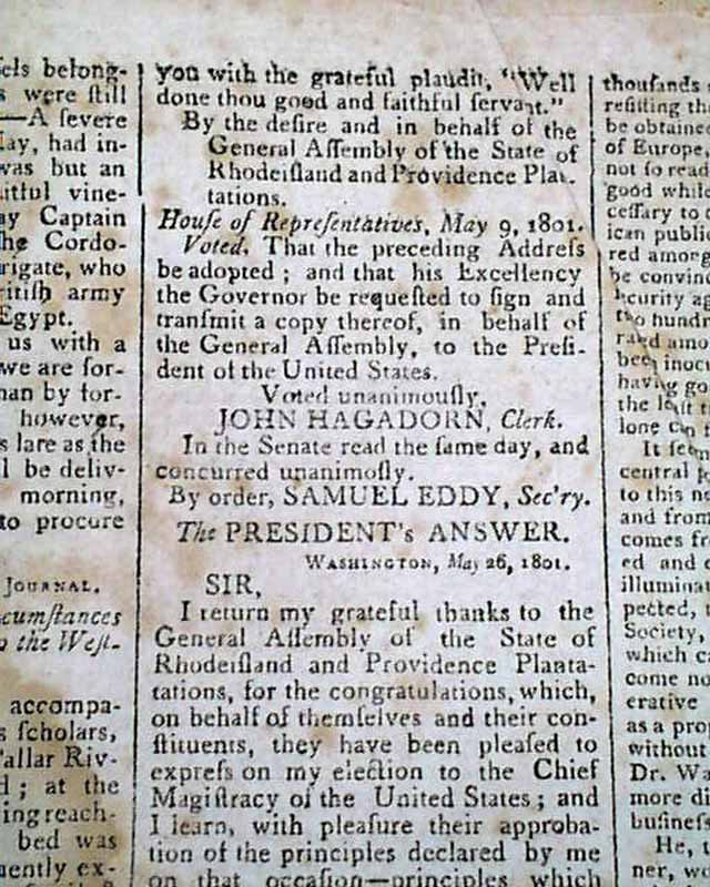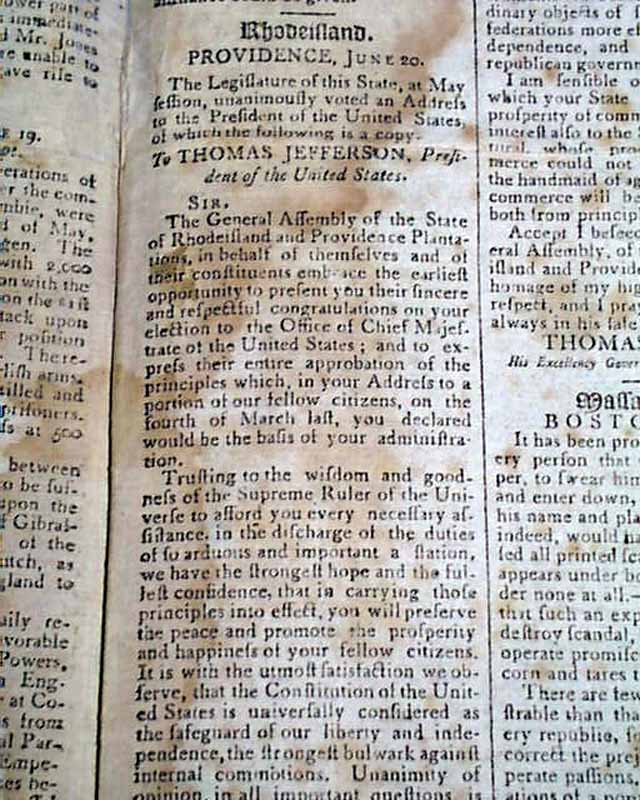 THOMAS'S MASSACHUSETTS SPY OR WORCESTER GAZETTE, July 1, 1801 Page 3 has an address by the legislature of Rhode Island to the President, congratulating him on being elected President of the United States. It is followed by: "The President's Answer" signed in type: Thomas Jefferson.