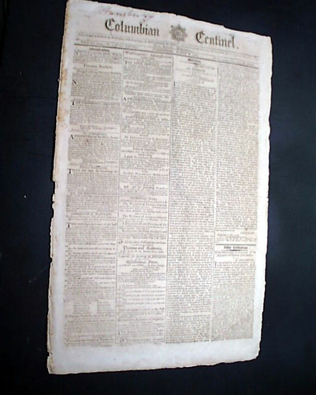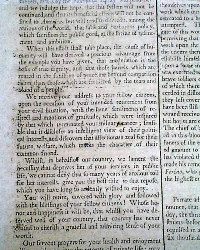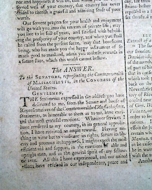 COLUMBIAN CENTINEL, Boston, March 8, 1797  Page 2 has an "Address To George Washington" from the "Senators representing Massachusetts in Congress" concerning his retirement from public life, followed by his humble and gracious reply, signed in type: G. Washington.