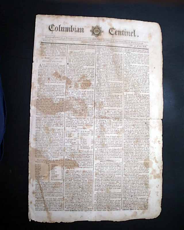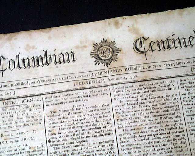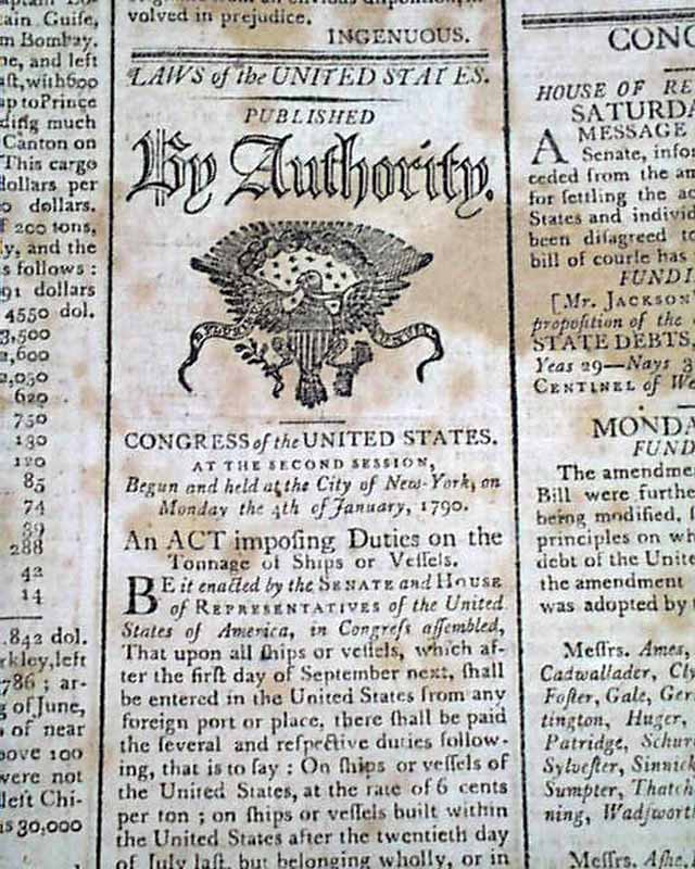 COLUMBIAN CENTINEL, Boston, Aug. 4, 1790 Almost a full page 2 column is taken up with an Act of Congress, headed with an engraving of a heraldic eagle, this is: "An Act Imposing Duties on the Tonnage of Ships or Vessels" which is signed in script type (desired) by the President: George Washington. Rarely is his full name spelled out in such documents.