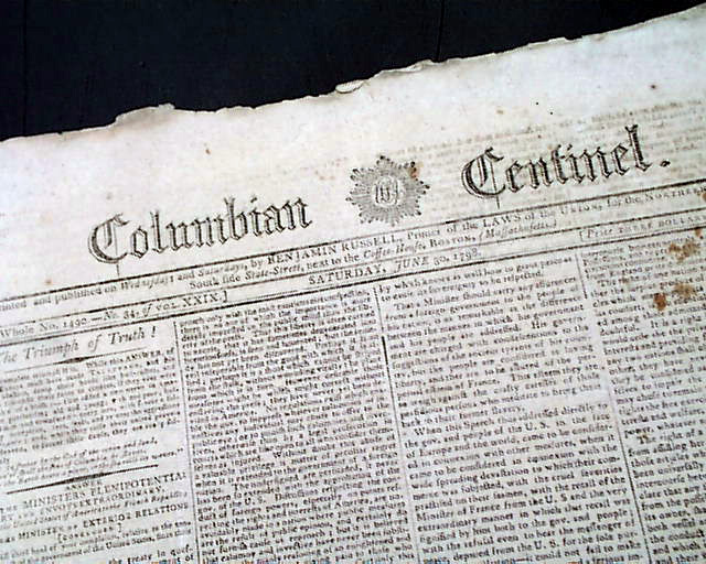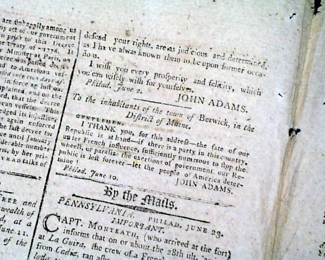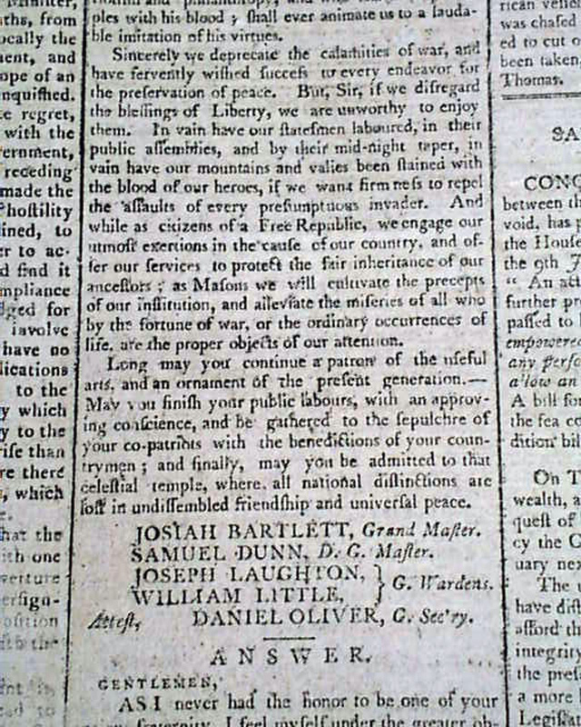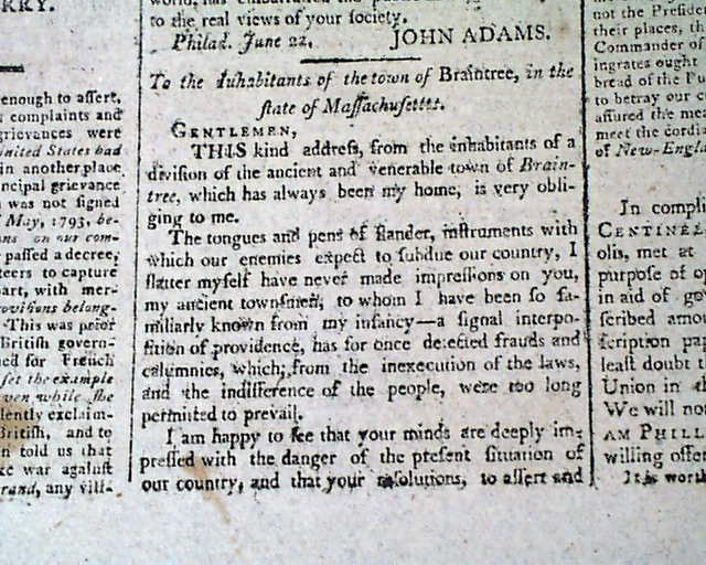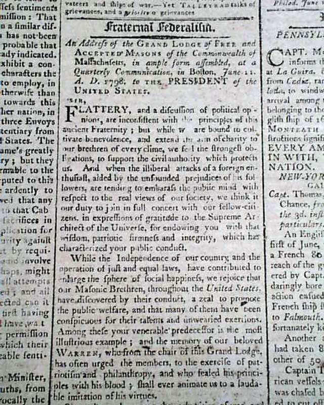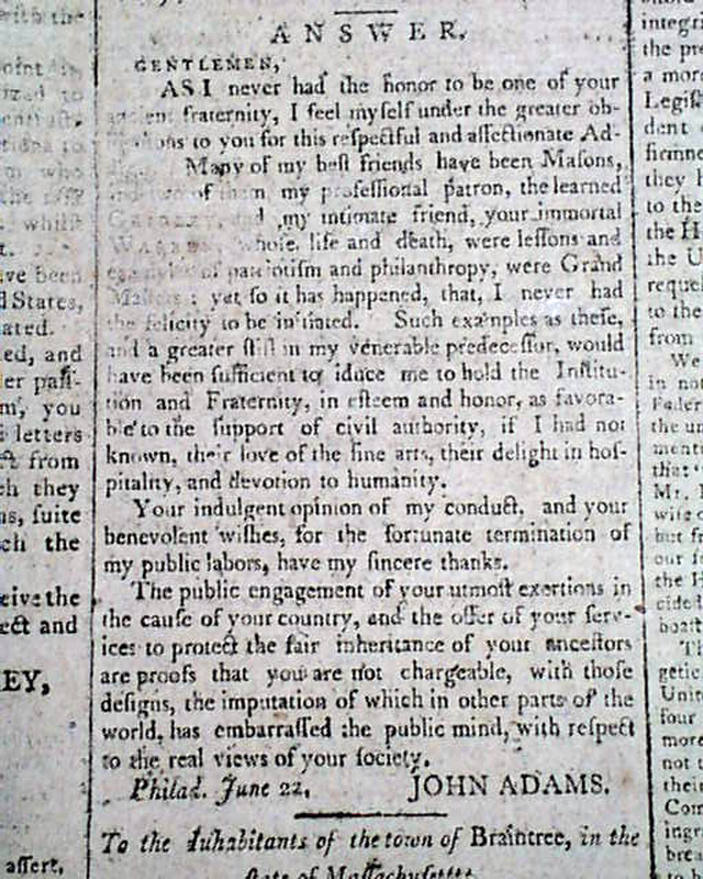 COLUMBIAN CENTINEL, Boston, June 30, 1798  Page 2 has an address of the Grand Masonic Lodge of Boston to the President, with his: "Answer" signed in type: John Adams. Also the President's letter to the people of Braintree, Mass., also signed: John Adams.