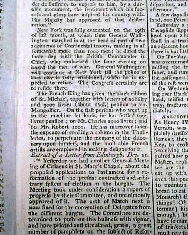 Following this historic report is a nice account noting the last British soldiers had left New York City, thus formally ending the Revolutionary War. The text reads: "New York was fully evacuated on the 29th of last month, at which time General Washington marched in at the head of part of two regiments of Continental troops, making in all somewhat more than 1000 men; he dined the same day with the British Commander in Chief who embarked the same evening on board the men of war. General Washington will continue at New York till the police of that city is fully established, when he is expected to retire. The Congress certainly are to reside there."