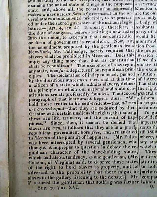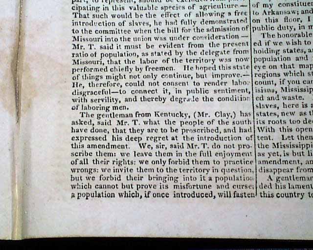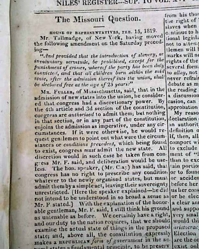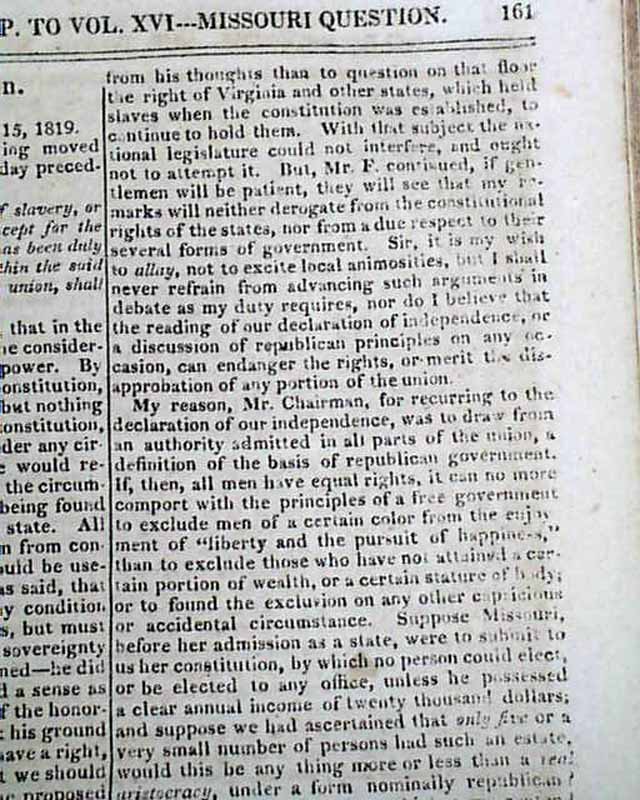 Page 161 begins: "The Missouri Question" which takes 11 pages with considerable text on the slave-related situation, and how Missouri would be admitted to the Union. This would be resolved by the Missouri Compromise of 1820.