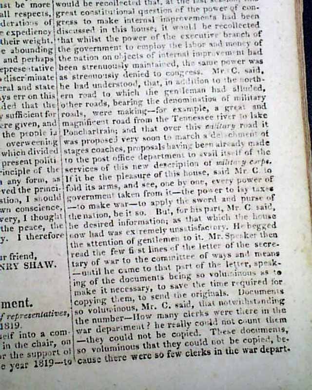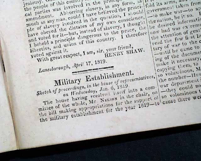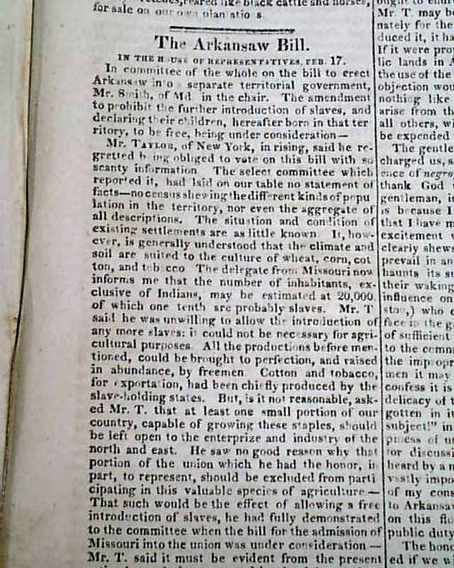 Page 173 has: "The Arkansaw [now Arkansas] Bill" discussion in the House of Representatives. The discussion begins with: "In committee of the whole on the bill to erect Armansaw into a separate territorial government..." with much on this, taking nearly 6 1/2 pages. Then much on the: "Military Establishment" which takes 5 1/2 pages.