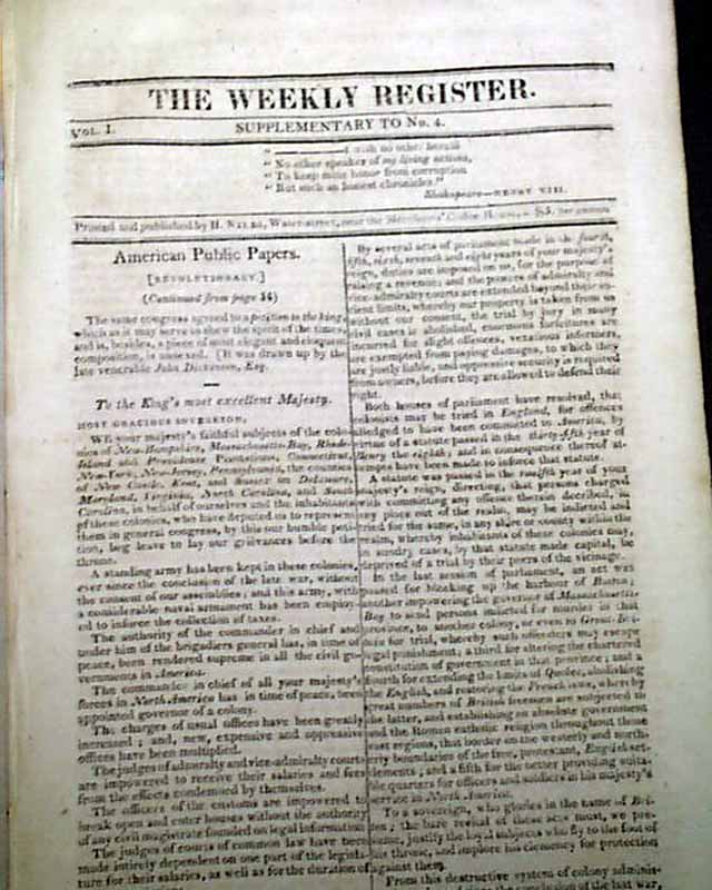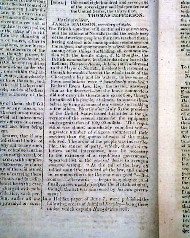 THE WEEKLY REGISTER, Baltimore, Sept. 28, 1811  The issue begins with over 3 pages taken up with: "The 'Affair' of the Chesapeake", an incident that happened 4 years prior between the ships Chesapeake and Leopard which nearly brought the two nations to war. Likely presented here given the recent President & Little Belt Affair, another catalyst for the War of 1812.
