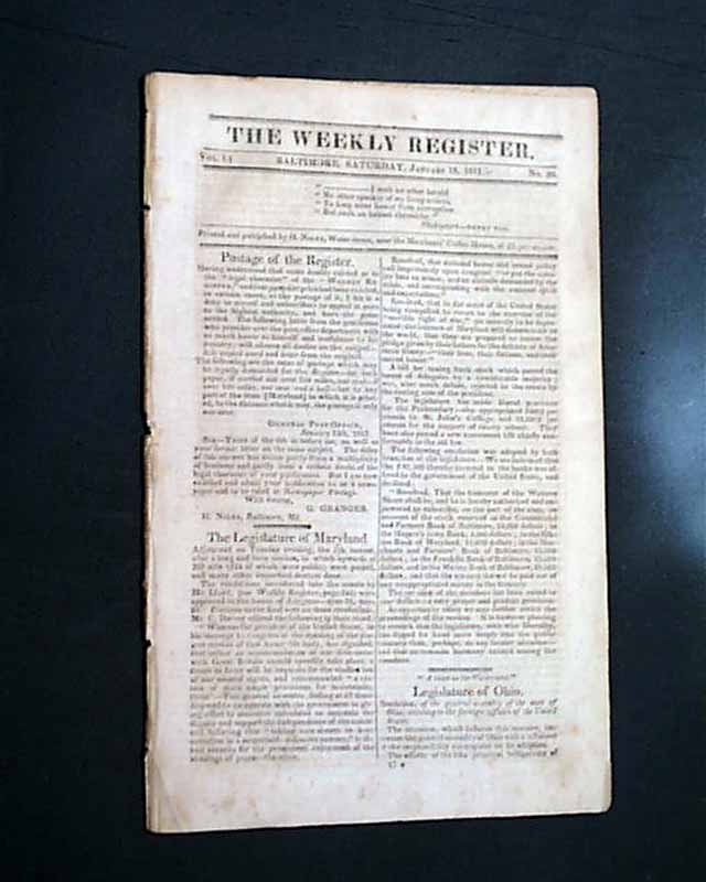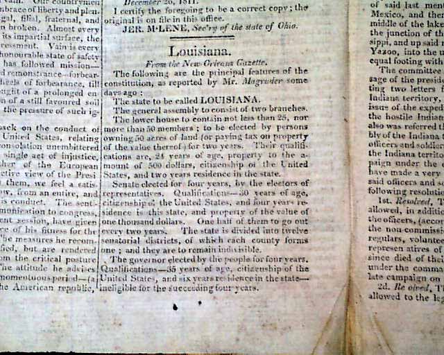 THE WEEKLY REGISTER, Baltimore, Jan. 18, 1812 (misprint of 1811 in dateline). Page 2 has: "Louisiana" with a prefacing note: "The following are the principal features of the constitution...".