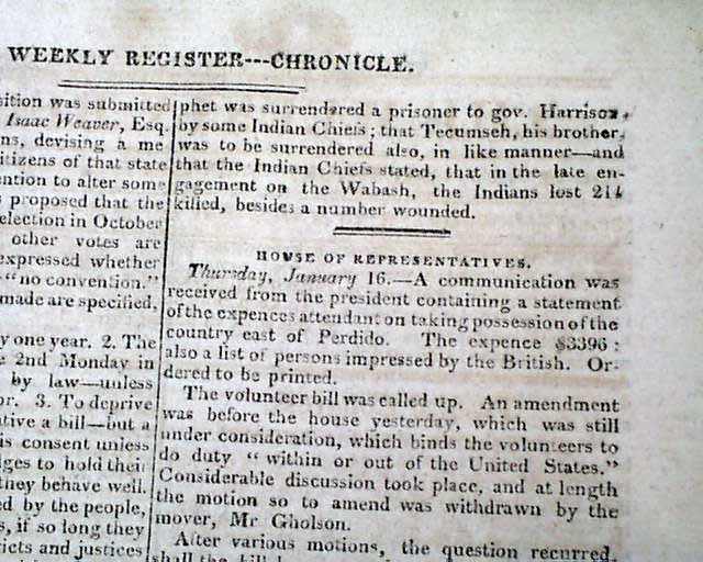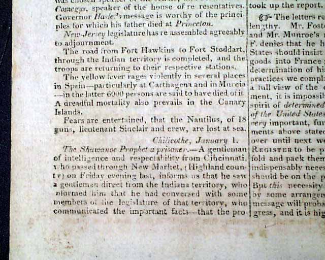The back page has: "The Shawannoe Prophet a Prisoner" which reports: "...that the prophet was surrendered a prisoner to gov. Harrison by some Indian Chiefs; that Tecumseh, his brother, was to be surrendered also, in like manner--and that the Indian Chiefs stated that in the late engagement on the Wabash, the Indians lost 214 killed, besides a number wounded."