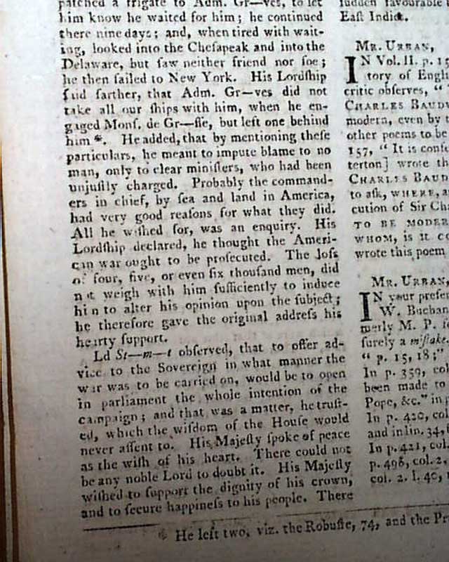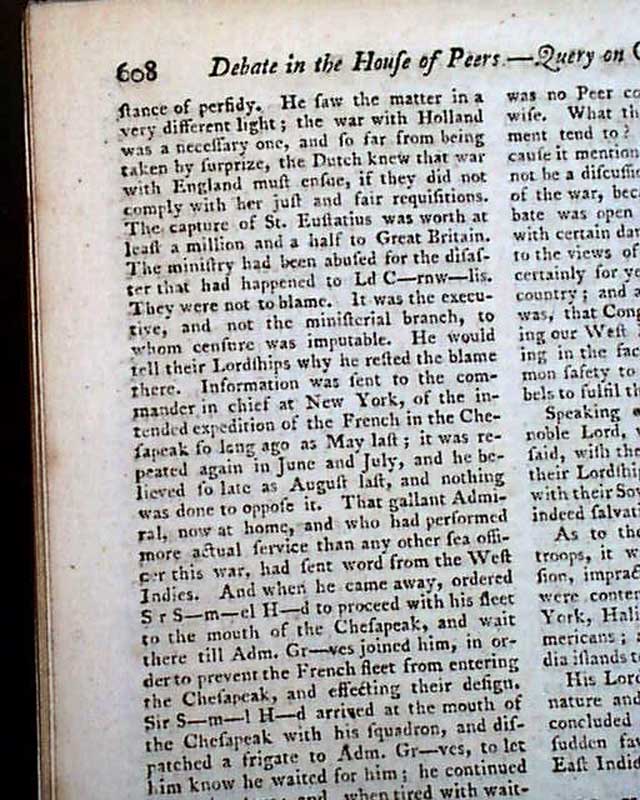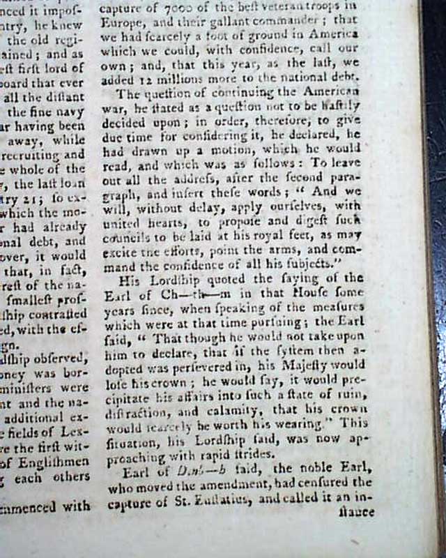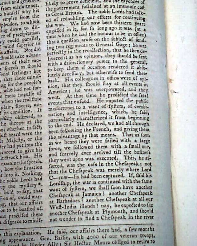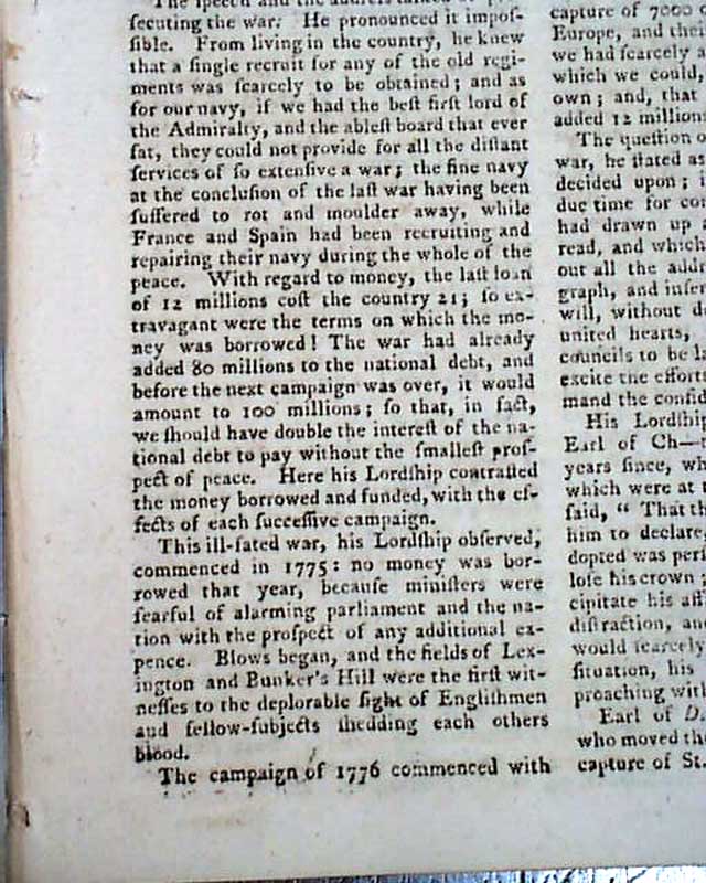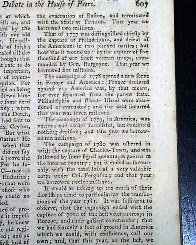 A lengthy article: "Interesting Debate in the House of Peers" includes some reflective discussion on the Revolutionary War, a few bits including: "This ill-fated war...commenced in 1775...Blows began & the fields of Lexington and Bunker's Hill were the first witnesses to the deplorable fight of Englishmen & fellow subjects shedding each others blood. the campaign of 1776 commenced with the evacuation of Boston & terminated with the affair at Trenton...That of 1777 was distinguished chiefly by the capture of Philadelphia & defeat of the Americans in two pitched battles; but how was it wound up? by the capture of 5000 of our finest veteran troops commanded by Gen. Burgoyne...The campaign of 1780 was ushered in with the capture of Charles-Town..." with more, including reference to the loss of Cornwallis at Yorktown.