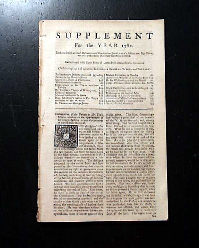 Item # 709842 GENTLEMAN'S MAGAZINE SUPPLEMENT, London, For the Year 1781 A very nice "Supplement" issue published at the end of the year, and from the Revolutionary War with a wide range of varied content including war reports, news of the day, political reports, literary items, and other tidbits.