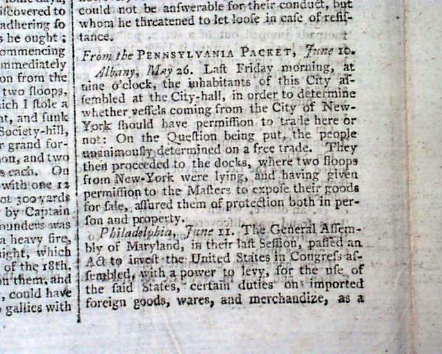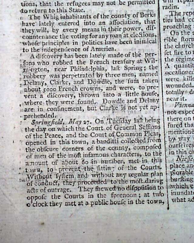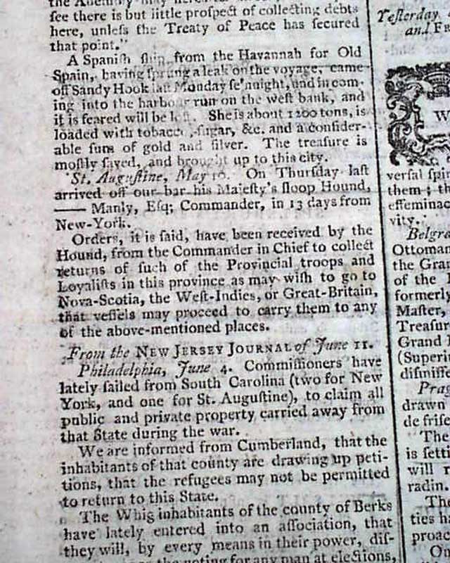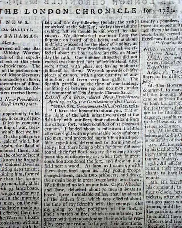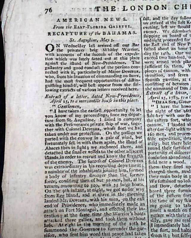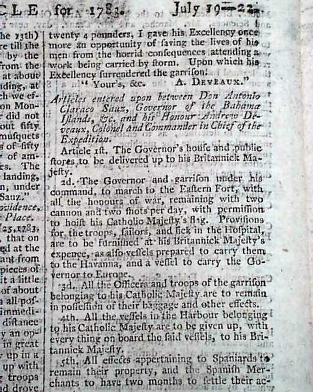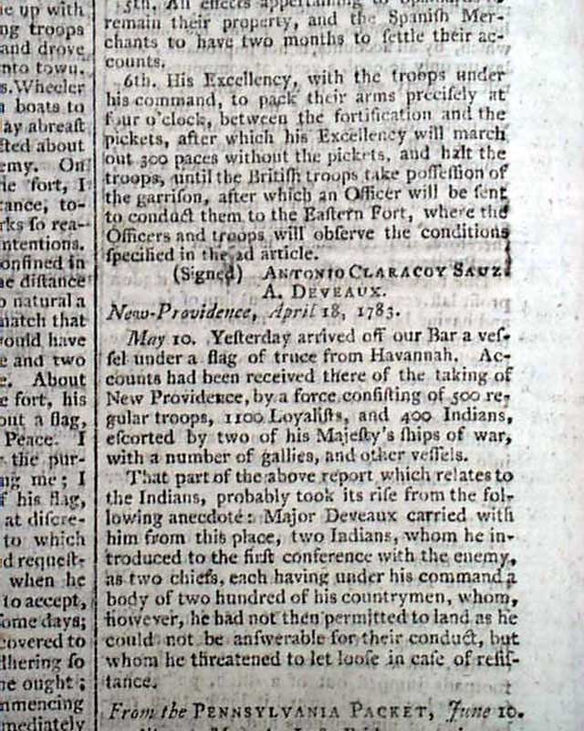 Most of page 4 is taken up with: "American News - Recapture of the Bahamas" which includes 4 letters reporting the details. Also including: "Articles Entered Upon Between Don Antonio Claraco Sauz, Governor of the Bahama Islands, and his Honour Andrew Deveaux, Col. and Commander in Chief of the Expedition". Another letter mentions: "...Accounts have been received there of the taking of New Providence by a force consisting of 500 regular troops, 1100 Loyalists, and 400 Indians...".
