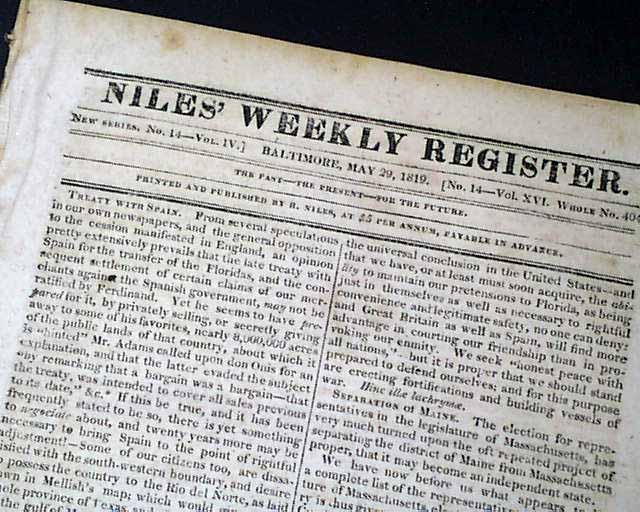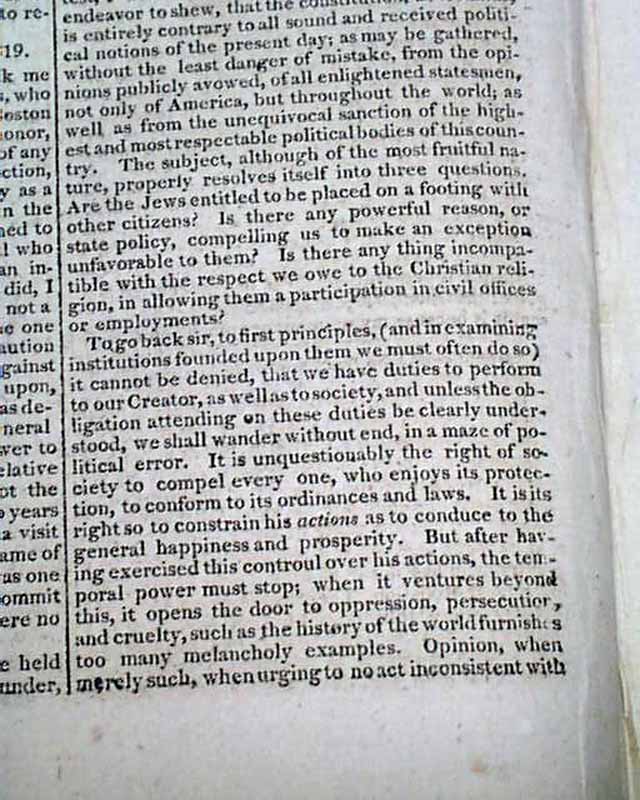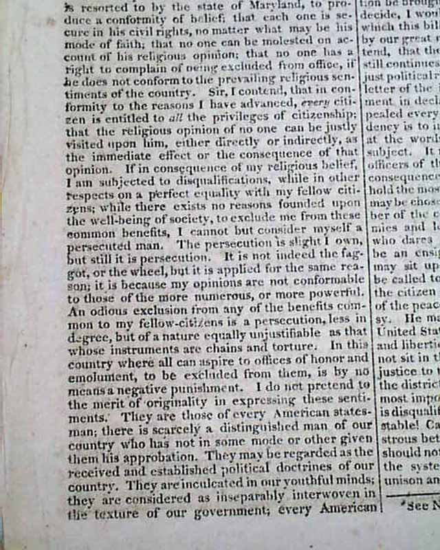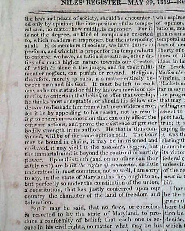 May 29, 1819 issue: Certainly the best content is full text of the speech presented by of H.M. Brackenridge in the Maryland House of Delegates when the Jew Bill was under consideration. The text of Brackenridge's speech is headed: "Religious Liberty" and has a prefacing paragraph before the full text carries on to take over six pages.
