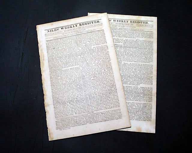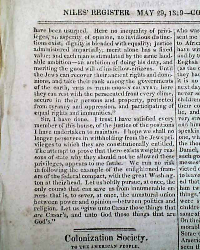 NILES' WEEKLY REGISTER, Baltimore, May 29, 1819 and March 5, 1825 A pair of issues on the passage of the Maryland "Jew Bill".