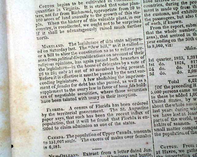 March 5, 1825 issue: The most notable content is the page 3 report headed: "Maryland", which states in part: "The legislature of this state adjourned on Saturday last. The 'Jew bill', as it is called--or a bill to alter the constitution so as to relieve persons from political disqualifications on account of their religious opinions, has again passed both branches of the legislature--in the house of delegates by a vote of 26 to 25; only 51 out of 80 members being present. Before it is effective it must be passed by the next succeeding legislature...".