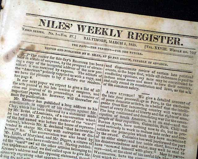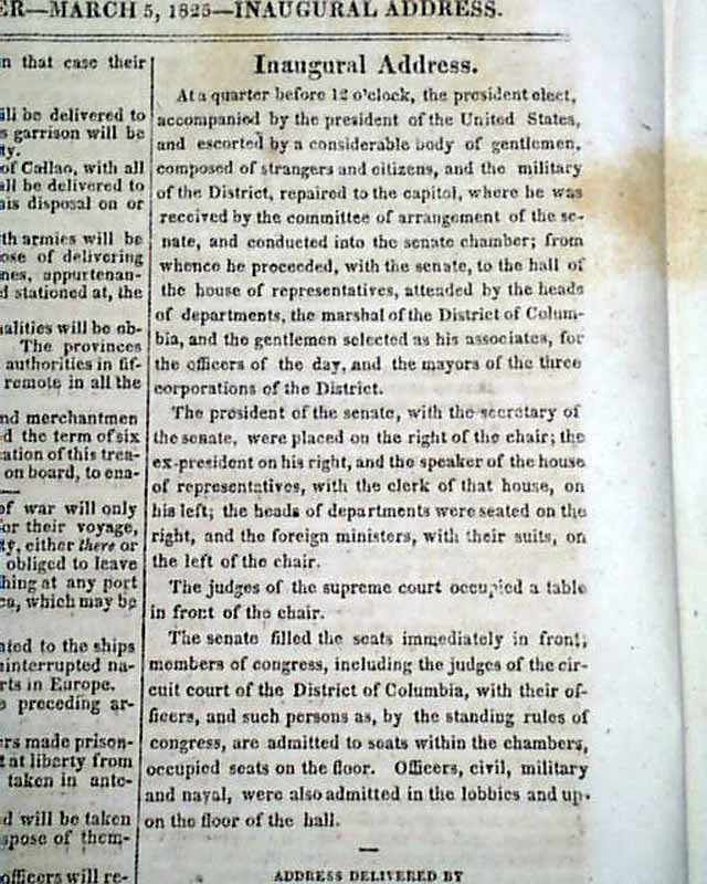 Also within this issue is the inaugural "Address Delivered by John Quincy Adams, On being sworn into office as President of the United States on the 4th of March, 1825" which takes over two pages.