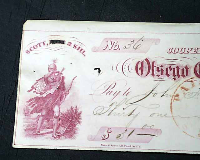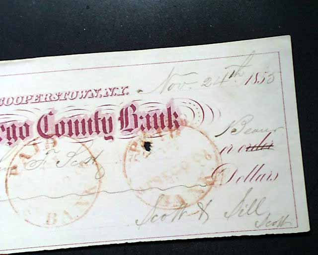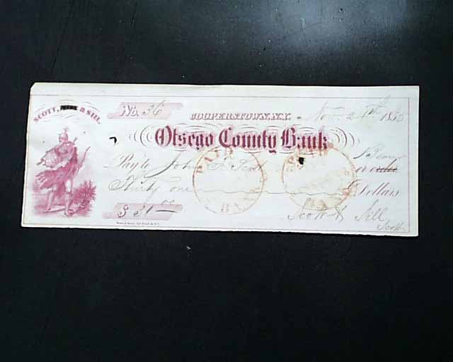 Item # 709910 An 1855 check drawn in the "Otsego County Bank" in Cooperstown, New York. A very handsome item which features an engraving of an Indian at the left side. Printed on maroon ink with 2 circular "Paid" stamps. About 2 3/4 by 7 3/4 inches and in nice condition.