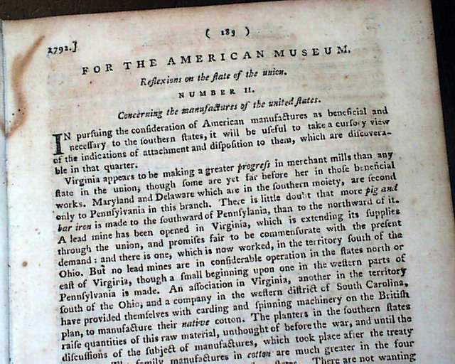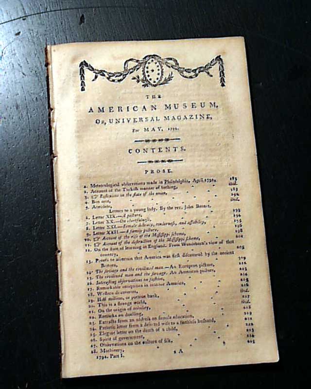Item # 709922 THE AMERICAN MUSEUM, Philadelphia, May, 1792 This title, along with the "Columbian Magazine", has the honor of being the first successful American magazine, both published in Philadelphia. The Museum was published by Mathew Carey and existed from January, 1787 thru the end of 1792.