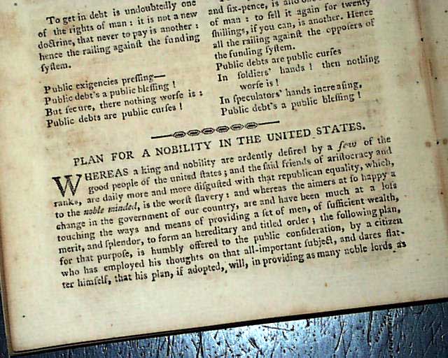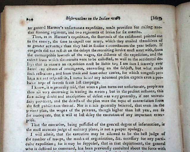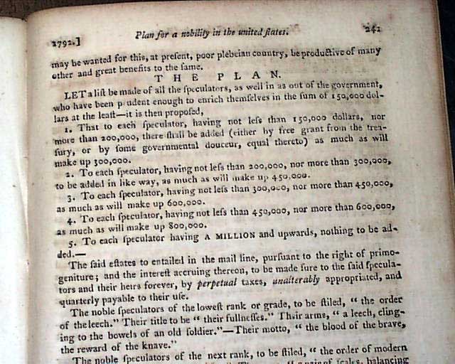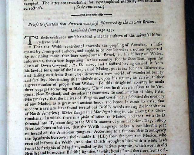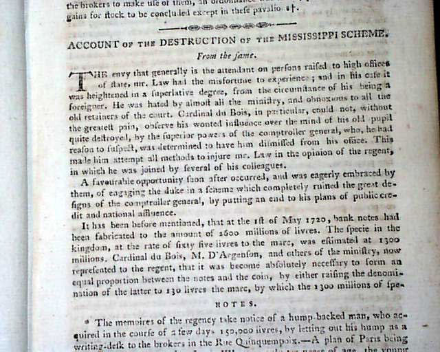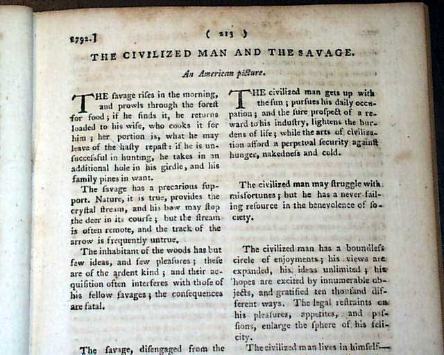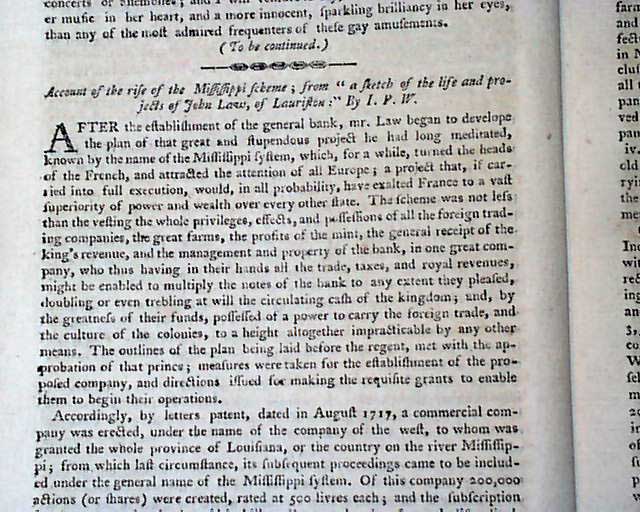 Content includes: "Account of the Rise of the Mississippi Scheme" "Account of the Destruction of the Mississippi Scheme" "Proofs to Ascertain that America was First Discovered by the Ancient Britons" "The Civilized Man & The Savage" "Remarkable Antiquities in Interior America" "Western Discoveries" "Remarks on Dueling"; a continuation of: "Account of the New Colony at Sierra Leone"; a continuation of: "Observations on the Indian War" "Discharge of the Four Nations" of Indians; and a very interesting: "Plans for a Nobility in the United States". Also present is a moving letter from a father written upon the untimely death of his child.