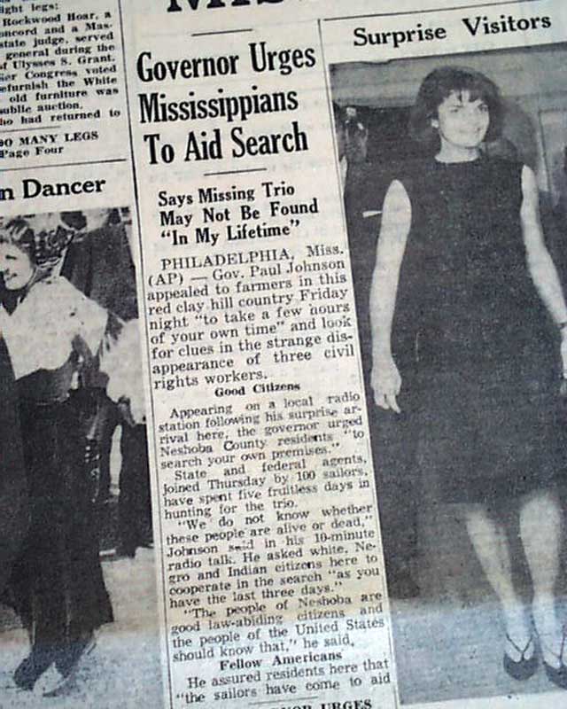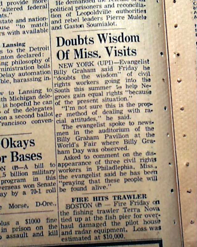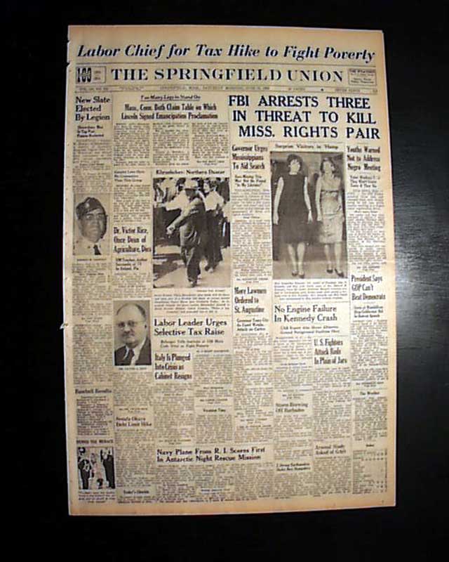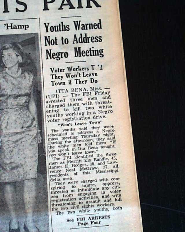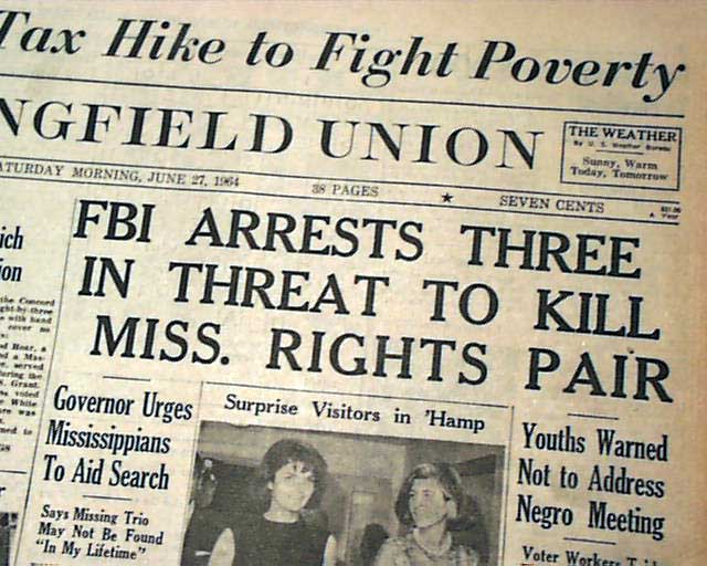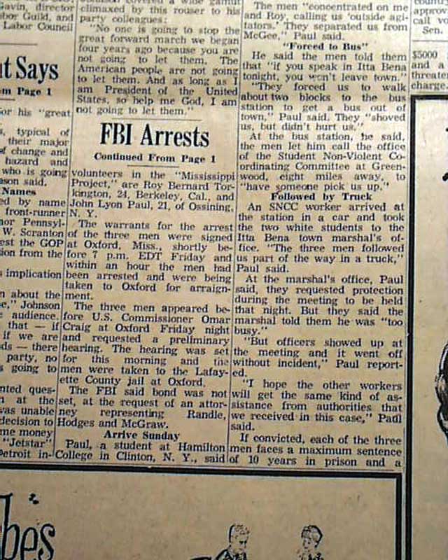 The top of the front page has a four column headline: "FBI ARRESTS THREE IN THREAT TO KILL MISS. RIGHTS PAIR" with subheads. (see images) This was a notable civil rights-related murder. Their bodies would be found on August 4 & 21 when white men--most members of the Ku Klux Klan including a local sheriff & his deputy--would be arrested.