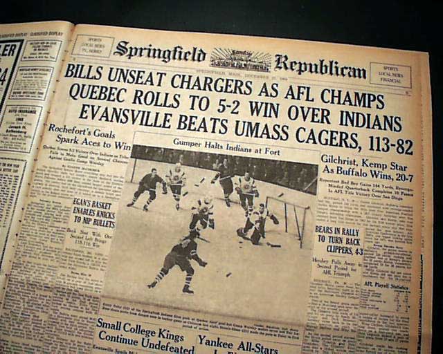 The front page of the sport's section has a nice banner headline: "BILLS UNSEAT CHARGERS AS AFL CHAMPS" with subheads and stats. (see images) First report coverage continues on the following pages with 2 related photos.