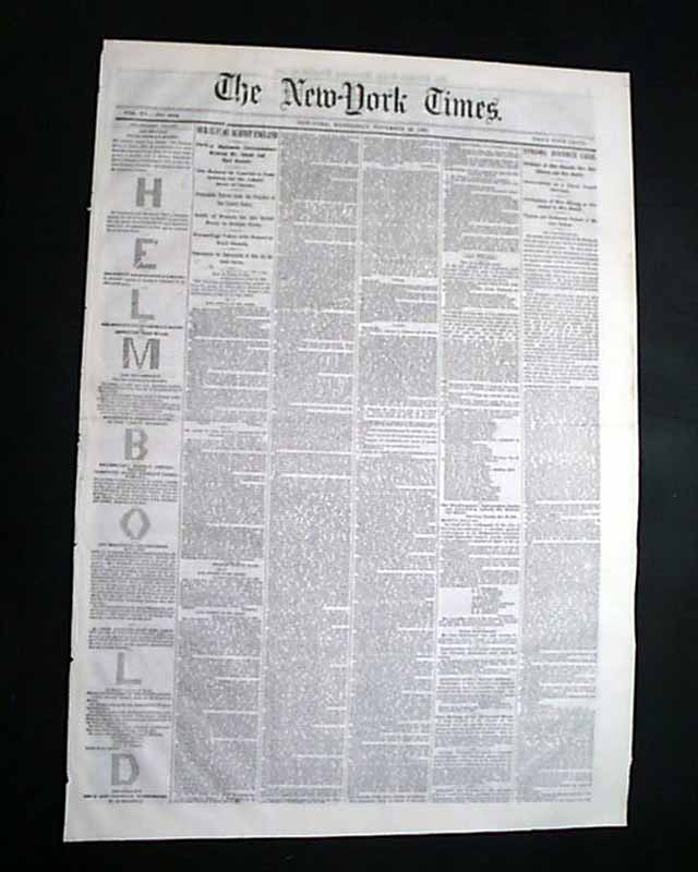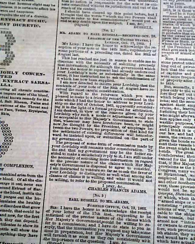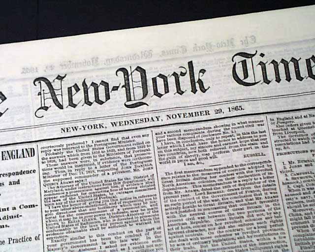 NEW YORK TIMES, Nov. 29, 1865 Front page column heads include: "OUR CLAIMS AGAINST ENGLAND" and "Further Diplomatic Correspondence Between Mr. Adams and Earl Russell", which provides the conversation between Mr. Adams and Earl Russell regarding debts related to the Civil War.