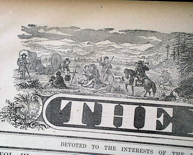 The masthead is one of the more graphic we have seen, featuring three vignettes: one of settlers traveling, one of a bear, and another of a detailed mining scene. The front page has part 8 of a continuing series: "Hoisting the Americn Flag at Monterey, Yerba Buena, Sonoma, Bodega, Sutter's Fort, San Jose and San Juan, by Order of John Drake Sloan, Commanding Pacific Squadron".