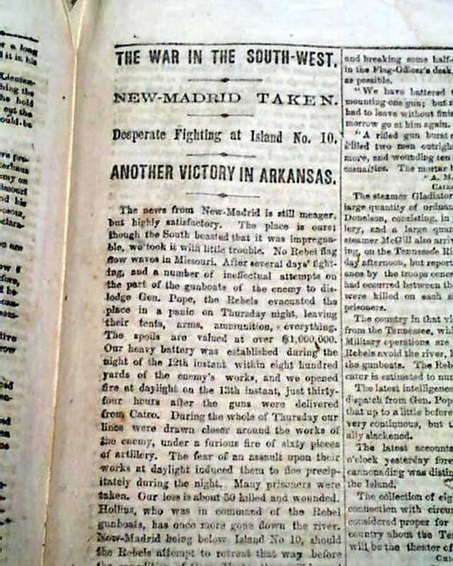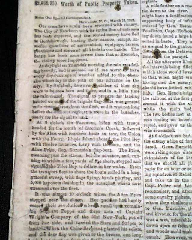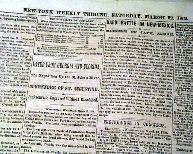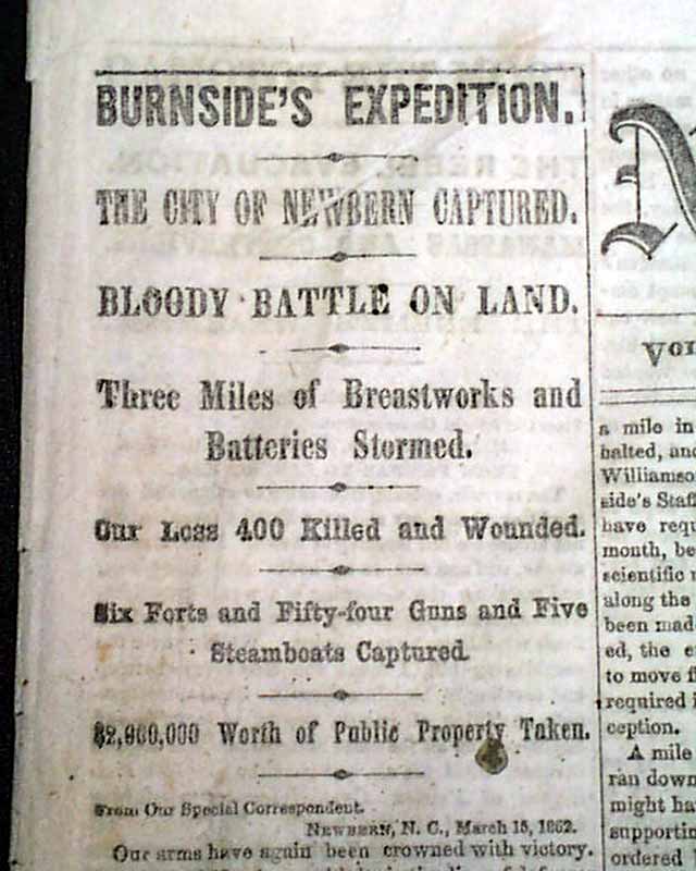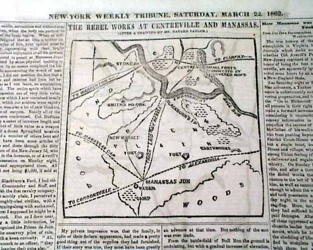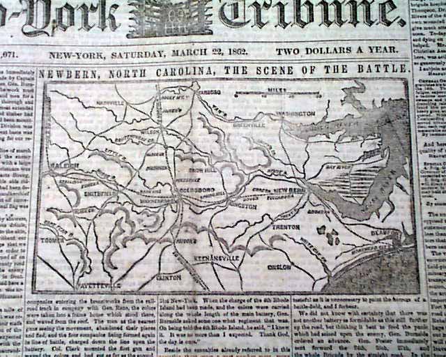 NEW YORK WEEKLY TRIBUNE, March 22, 1862  The front page features a Civil War map: "NEW BERN, NORTH CAROLINA, THE SCENE OF THE BATTLE" with related reports on the capture of New Bern.