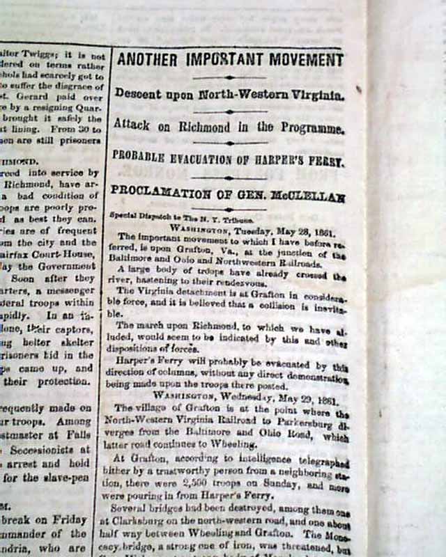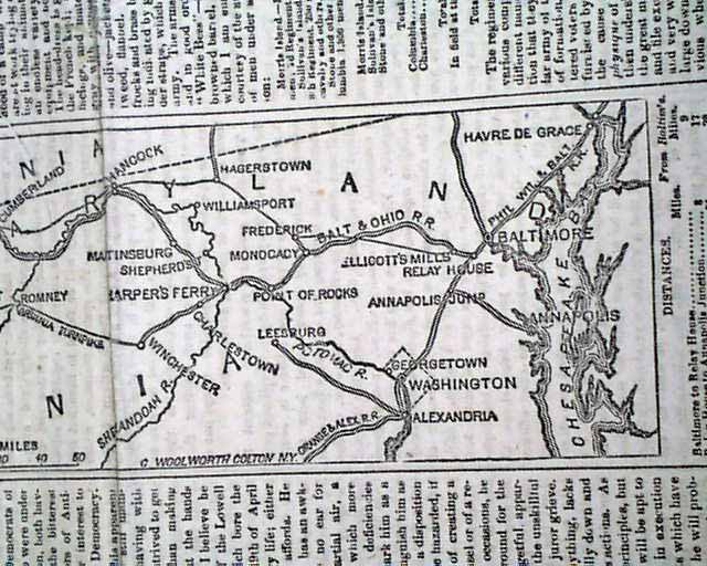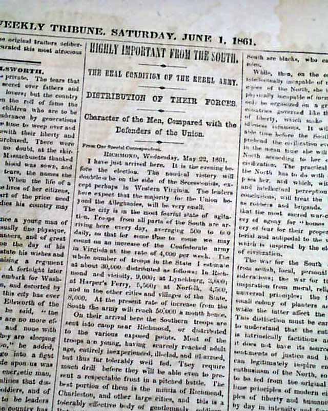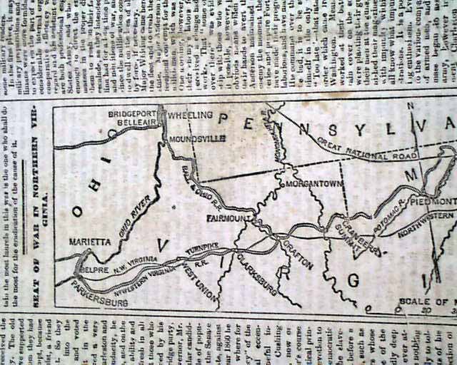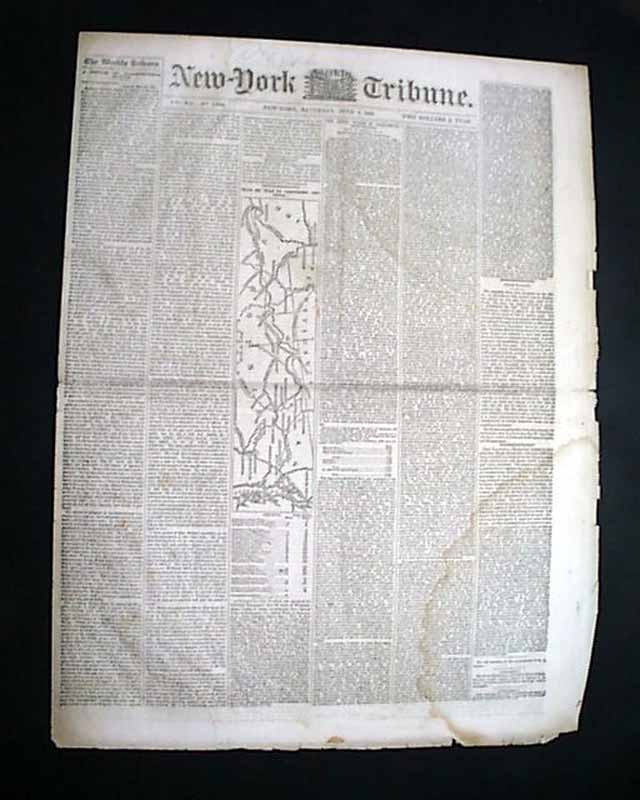 NEW YORK WEEKLY TRIBUNE, June 1, 1861  The front page has a one column map headed: "Seat of War In Northern Virginia" which also shows portions of Pennsylvania, Maryland and Ohio.