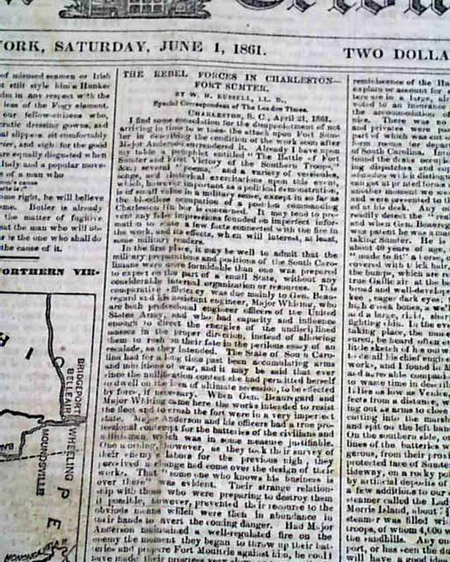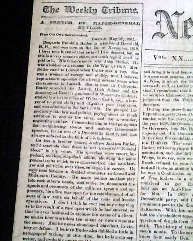 The front page also features a lengthy article headed: "A Sketch of Major-General Butler" as well as: "The Rebel Forces In Charleston--Fort Sumter". Many Civil War reports and one column heads on the inside pages.