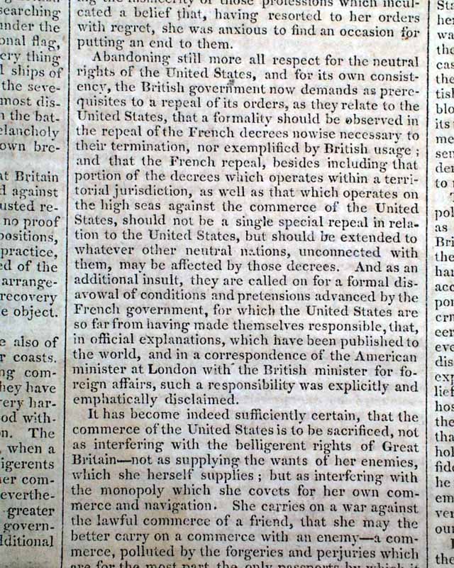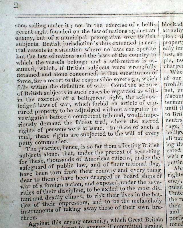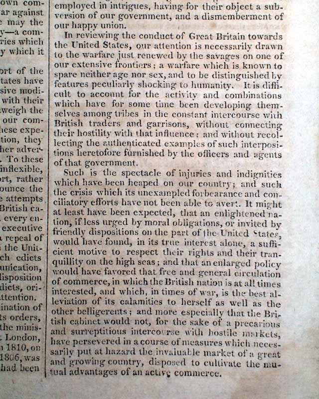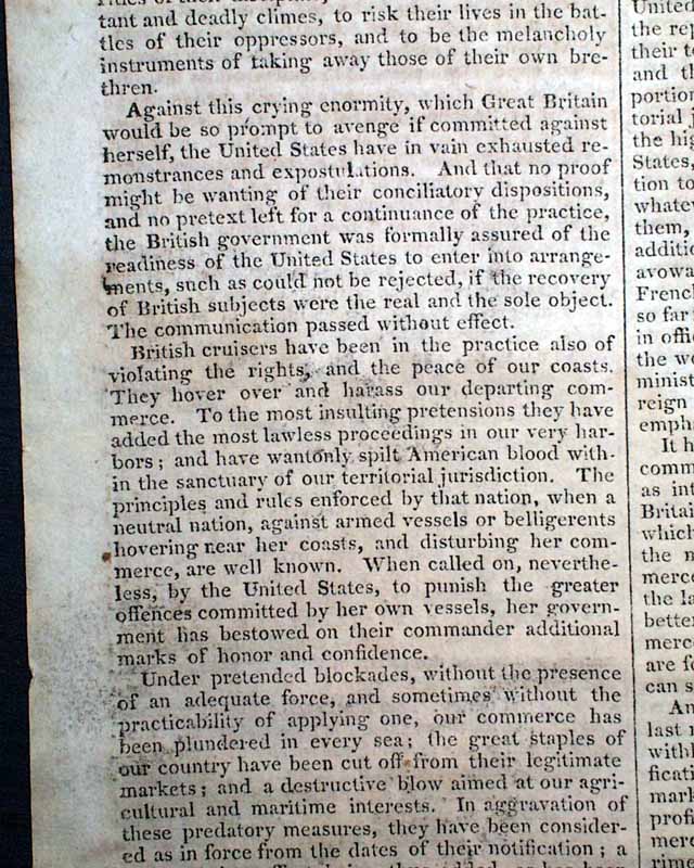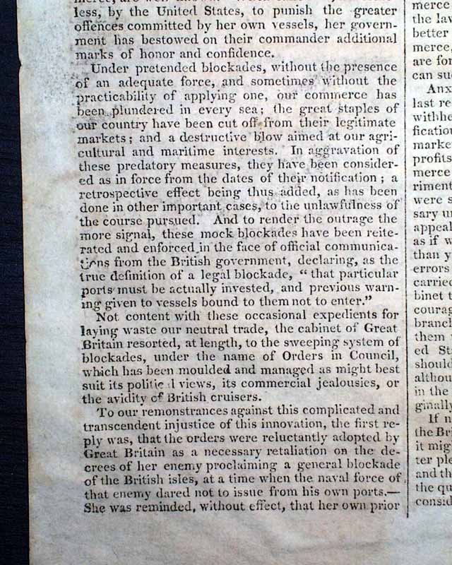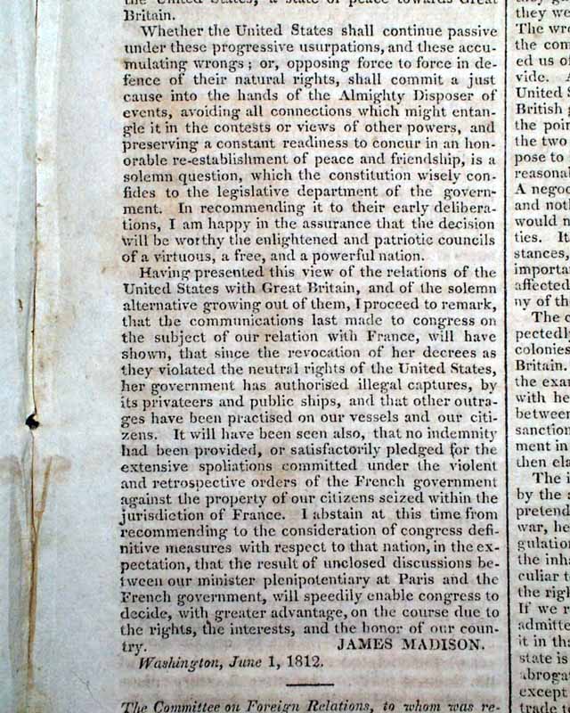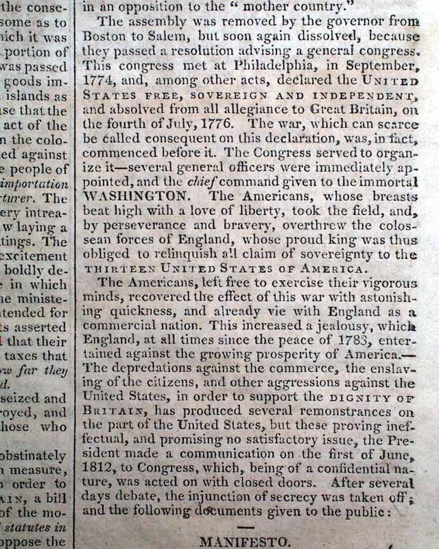 Beginning on the front page and taking all of page 2 is the: "Manifesto - To the Senate & House of Representatives of the United States", this being the President's request to Congress to declare war against England. It is signed in type: James Madison. A very significant document.