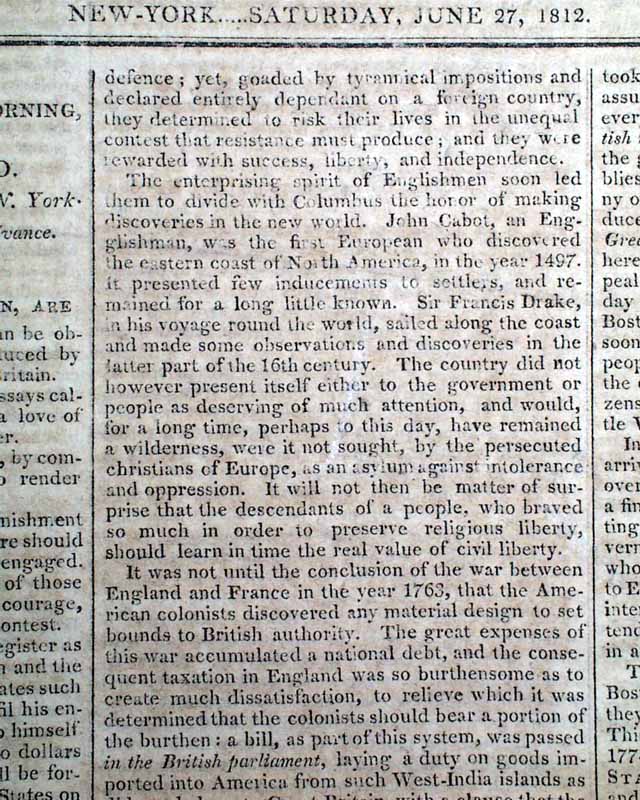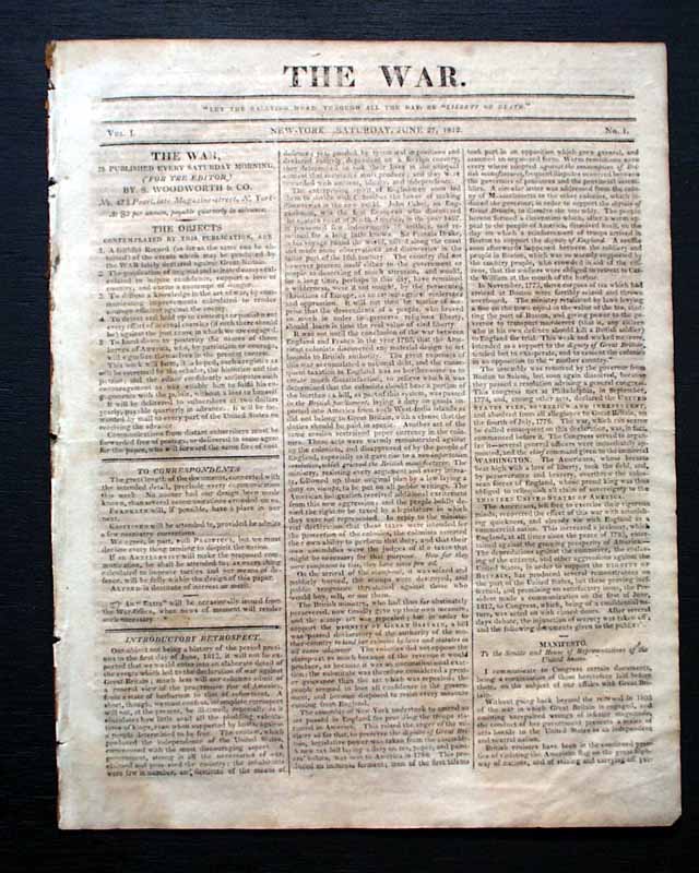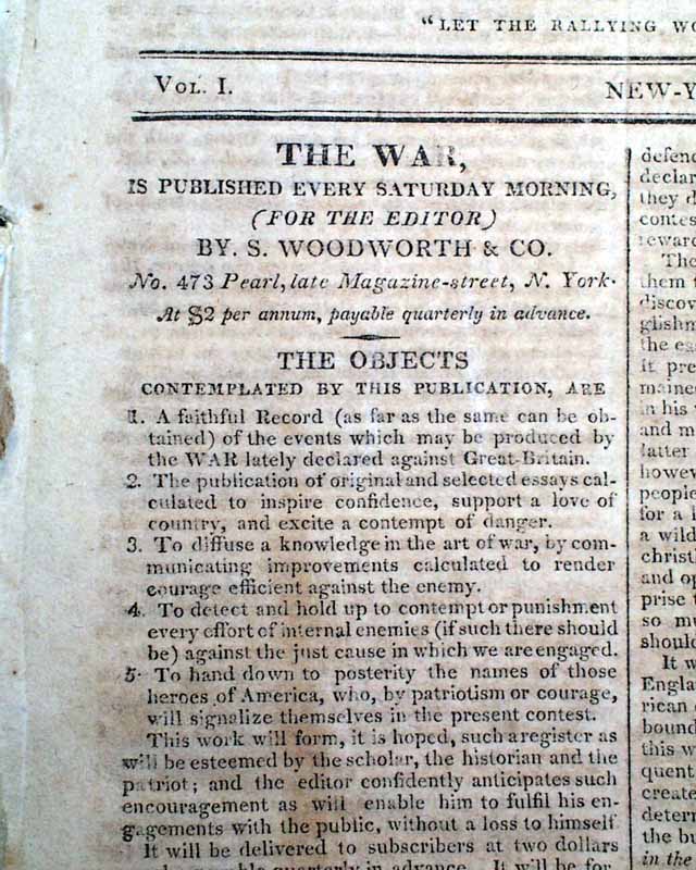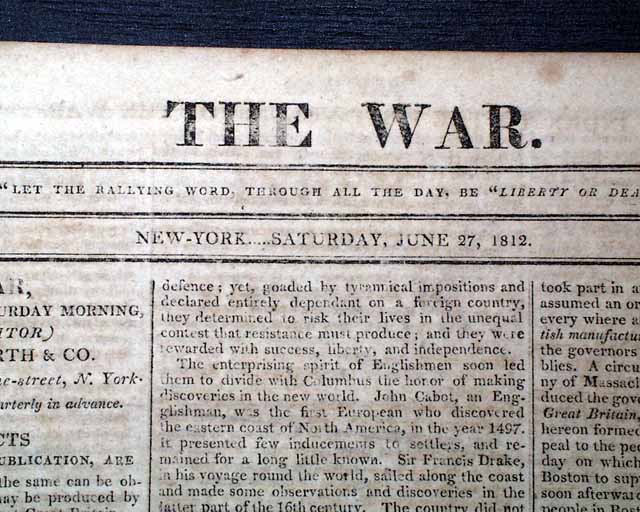 THE WAR, New York, June 27, 1812  This is a very interesting newspaper as it existed for one purpose: to report the news from the War of 1812. It began publication shortly after the war began, & ceased to publish once the war was over.