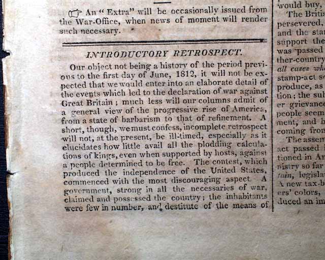 The front page is taken up with the: "Introductory Retrospect" in which the editor reflects upon the events previous to this day which led to the War of 1812.
