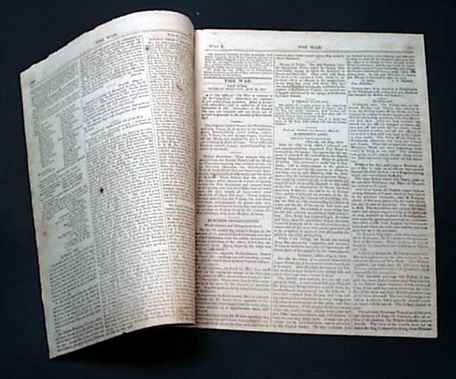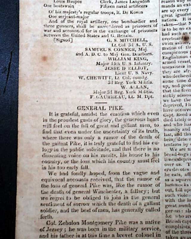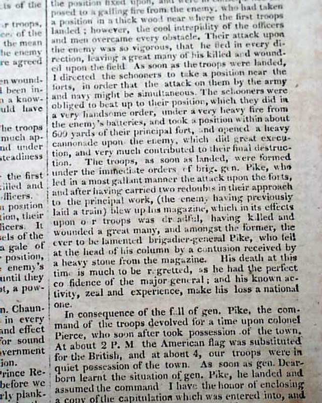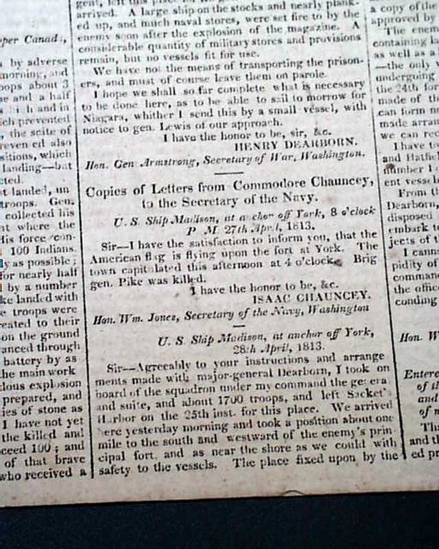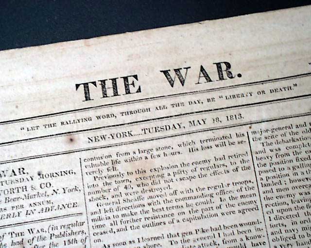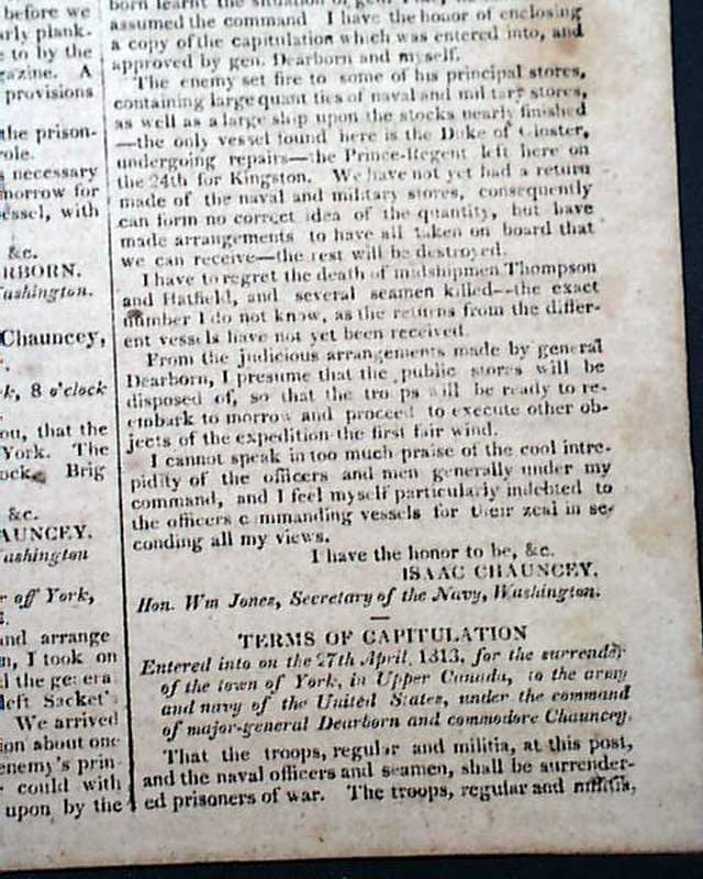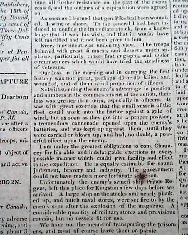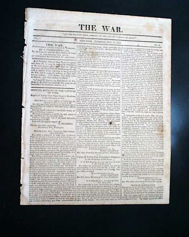 THE WAR, New York, May 18, 1813 The entire front page, and part of page 2, are taken up with documents headed: "Official Account of The Capture of York" which includes a prefacing document signed: H. Dearborn, plus a more detailed letter from York, signed: Henry Dearborn, and a lengthy letter from the U.S. ship Madison at York, signed: Isaac Chauncey, followed by the: "Terms of Capitulation" which carry over to page 2. This is followed by: "General Pike" which deals with his death.