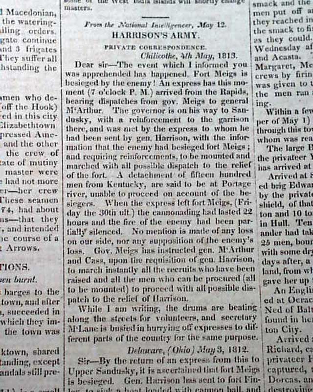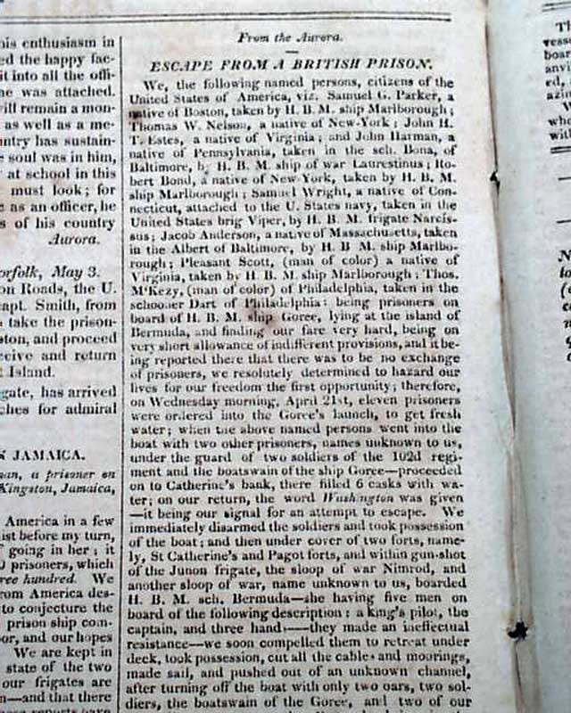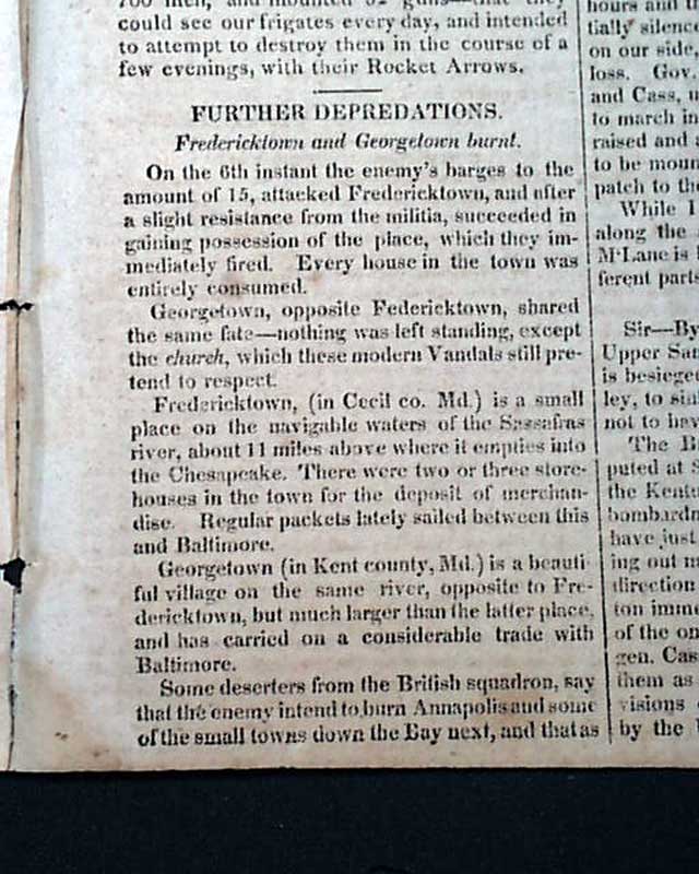 Elsewhere in the issue are: "American Prisoners in Jamaica' "British Deserters" "Further Depredations--Fredericktown & Georgetown Burnt" "Harrison's Army" "Escape from a British Prison" and even more.