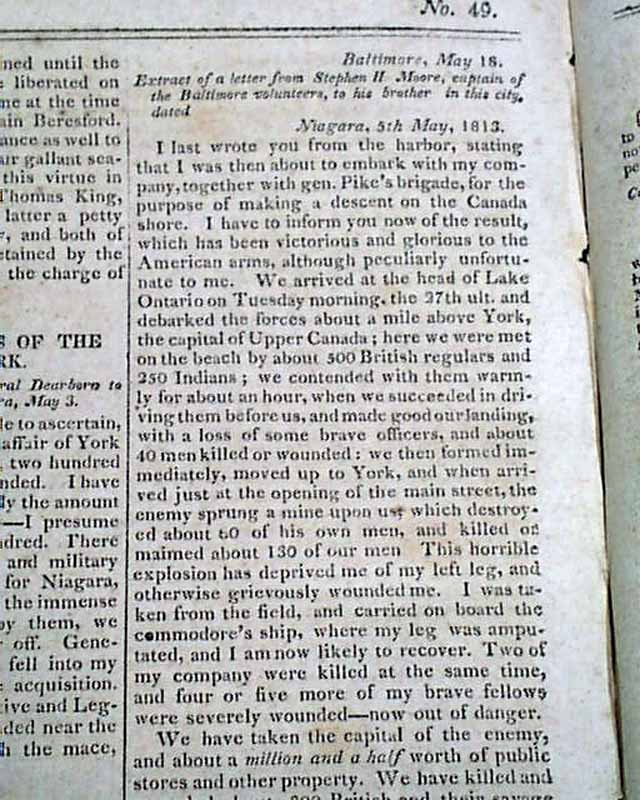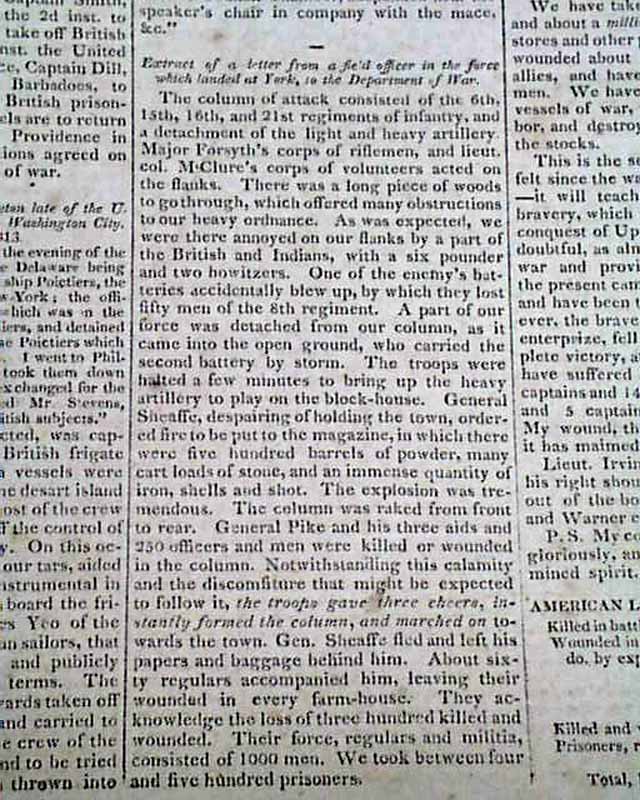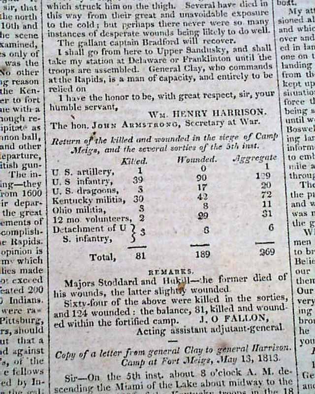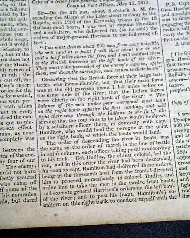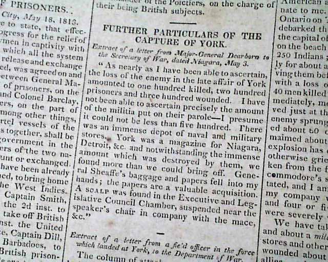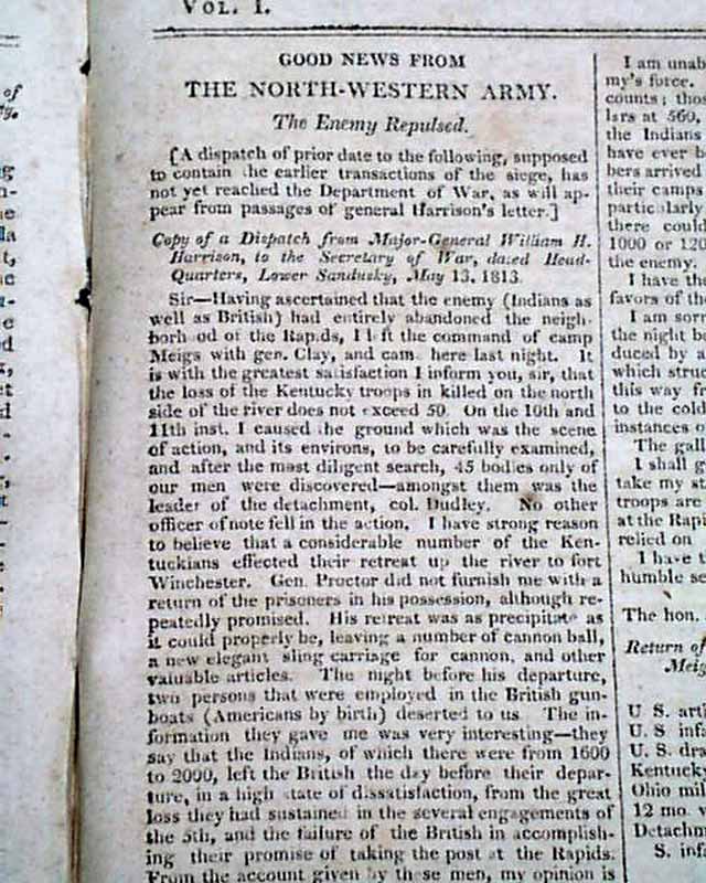 Items inside include: "Exchange of Prisoners" "Further Particulars of the Capture of York" (present-day Toronto); "Good News From the North-Western Army--The Enemy Repulsed" which is a lengthy letter on the Battle of the Miami, or the siege of Fort Meigs, signed in type: Wm. Henry Harrison; "From Lake Ontario" "Our Military Prospects" and even more.