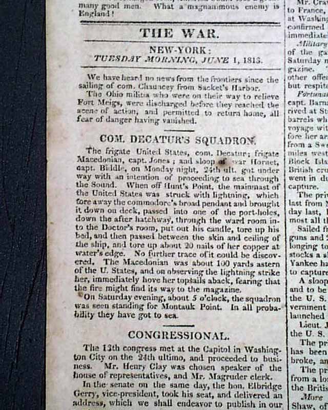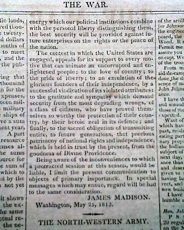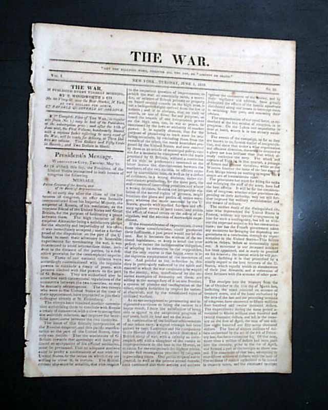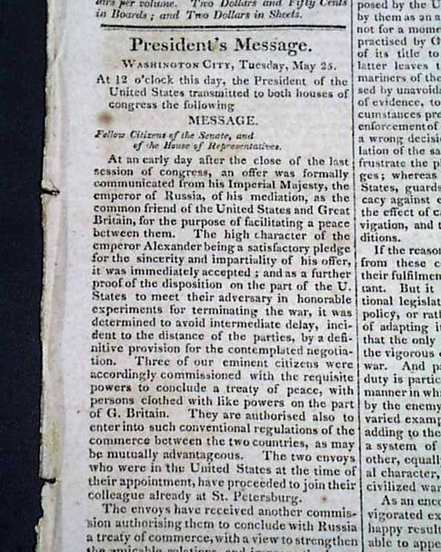 THE WAR, New York, June 1, 1813 The entire front page and half of page 2 are taken up with the: "President's Message" which is signed in type: James Madison. In it the President announces the United States' acceptance of an offer by the Emperor Alexander of Russia to mediate a resolution to the conflict with Britain and his hopes that this negotiation will end the war quickly. Madison also summarizes the successes of the new Army and Navy, while requesting a tax increase from Congress to finance the conflict.