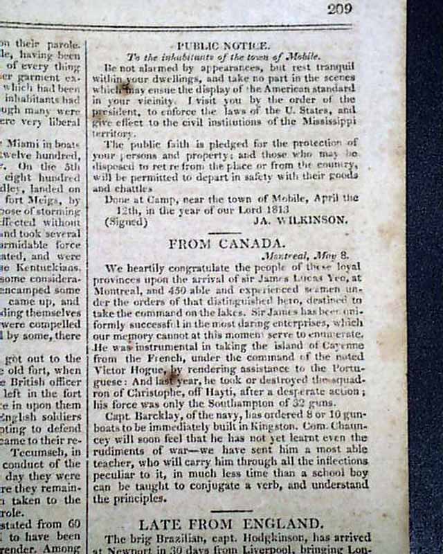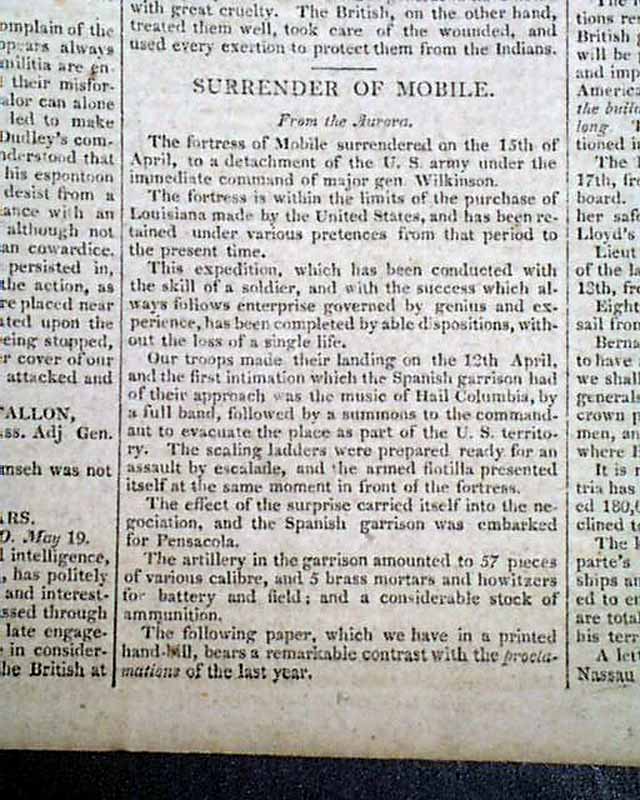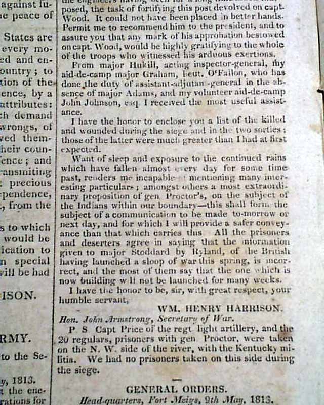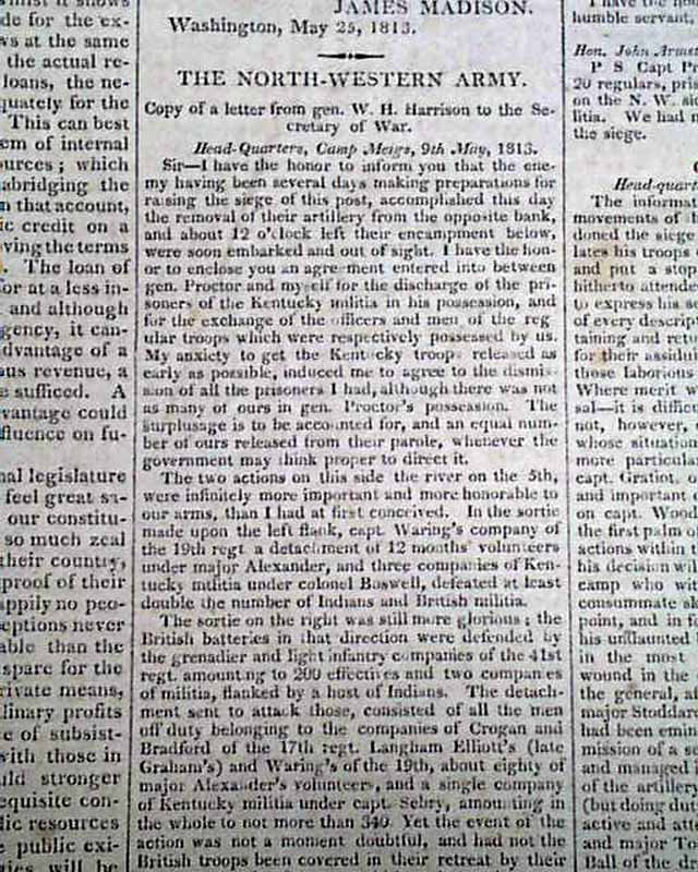 Other articles within: "The North-Western Army" which is a fine letter on the siege of Fort Meigs, signed in type: Wm. Henry Harrison. Also: "General Orders which takes over one-third of a page & is signed: John O'Fallon; "Interesting Particulars" "Surrender of Mobile" "From Canada" "Com. Decatur's Squadron" "Impressed American" and more.