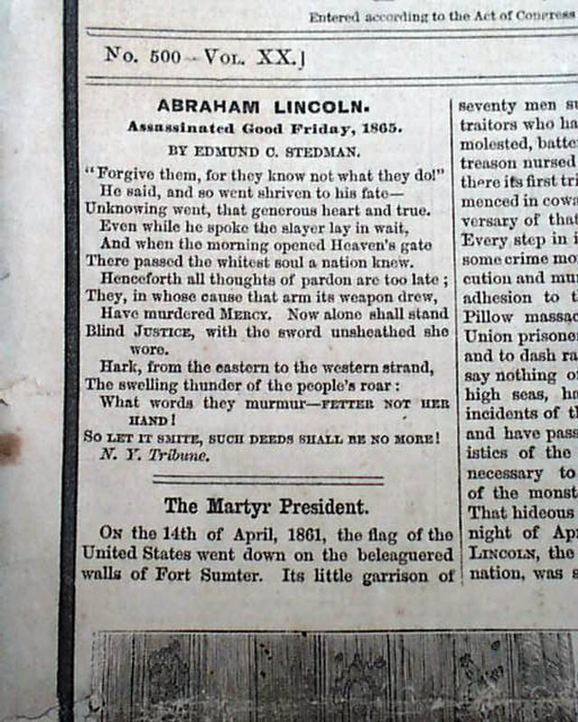 Over half of the front page is taken up with a very dramatic print captioned: "Assassination of President Lincoln in His Private Box at Ford's Theatre, Washington, April 14" with front page text as well, headed: "The Martyr President".
