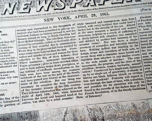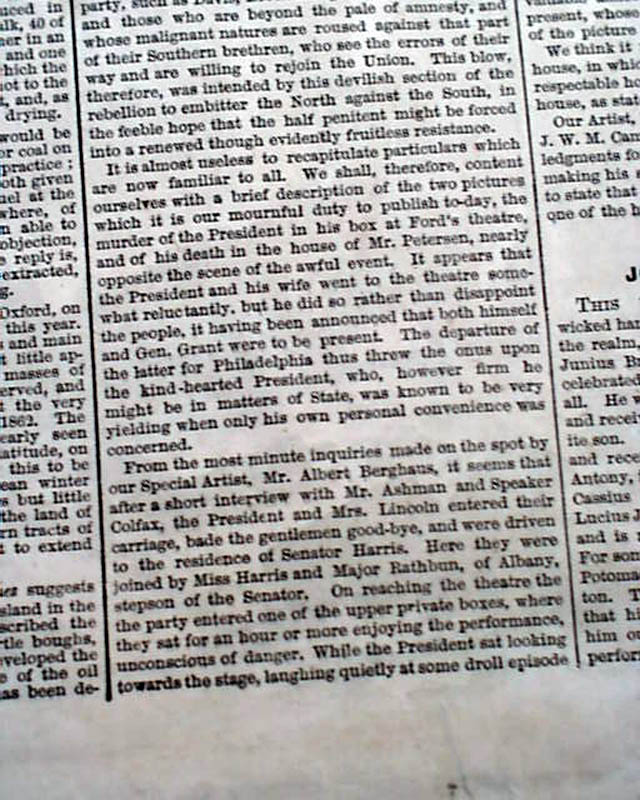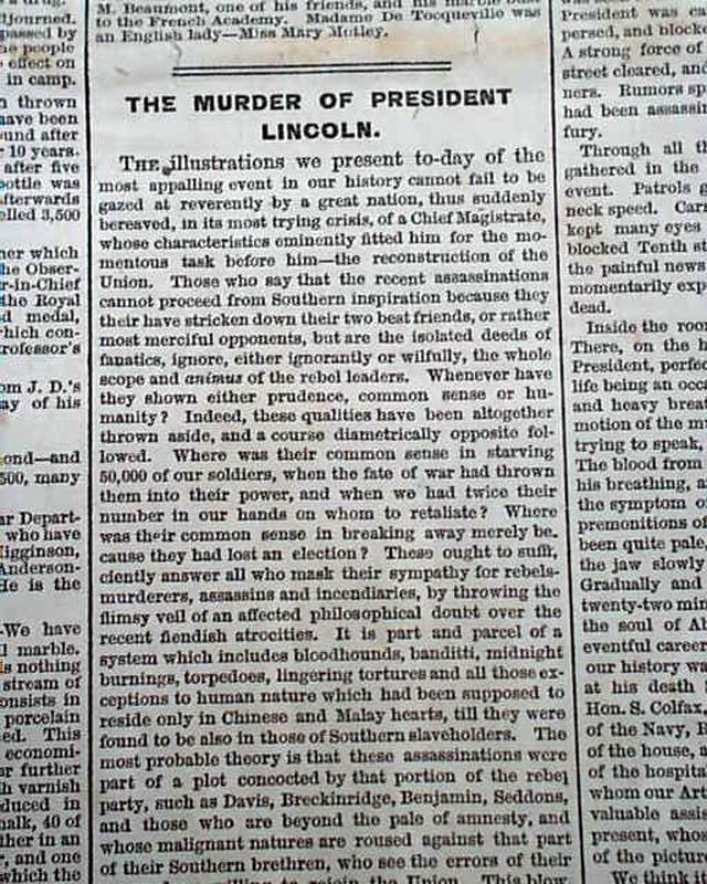 This issue remains one of the most desired for this historic, tragic event, as it is one of the only newspapers which included a front page graphic showing the actual assassination of Abraham Lincoln.