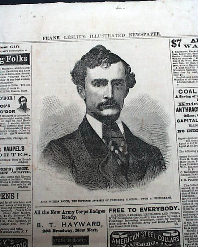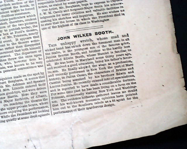 The back page has a nice portrait captioned: "John Wilkes Booth, the supposed assassin of President Lincoln." Page 3 has an article: "The Murder of President Lincoln" with subhead: "The Deathbed of President Lincoln", as well as another article titled: "John Wilkes Booth" which begins: "This unhappy wretch, whose mad and wicked hand has struck down the foremost man in all the realm..." with a bit more.