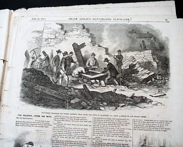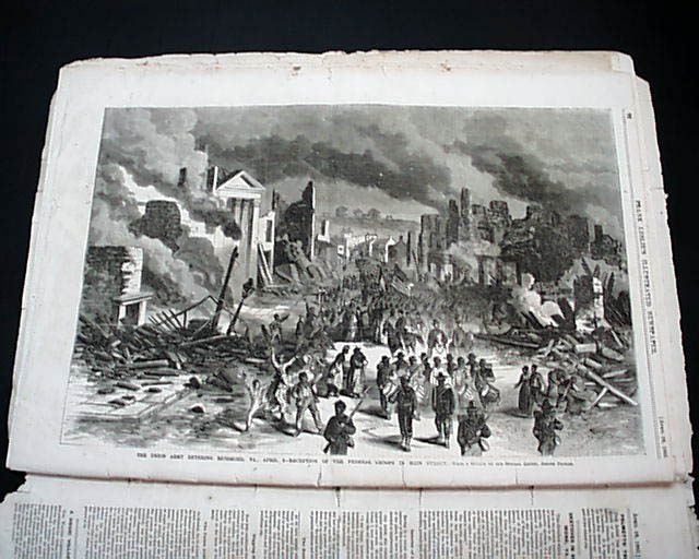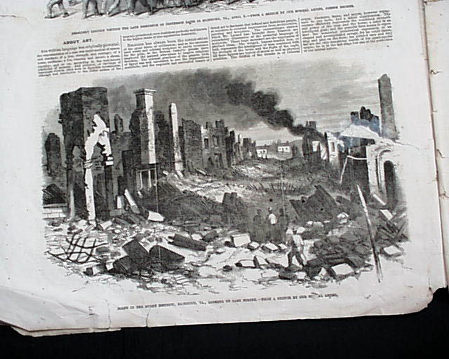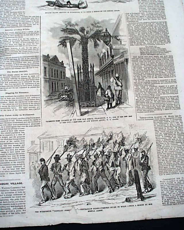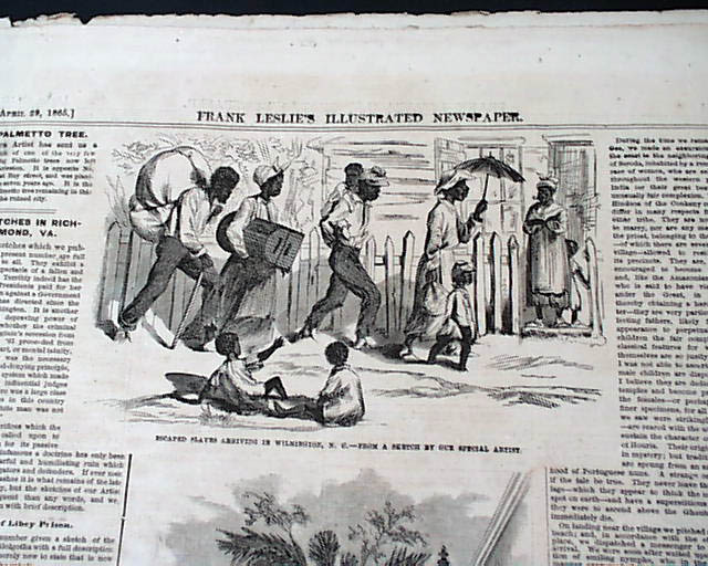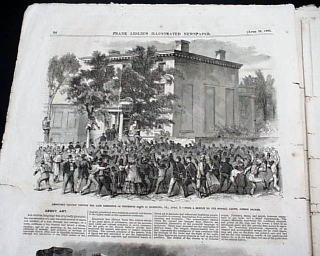 Other prints include: "Escaped Slaves Arriving in Wilmington, N.C." "The Union Army Entering Richmond, Va--Reception of the Federal Troops in Main Street" "President Lincoln Visiting the Late Residence of Jefferson Davis in Richmond" "Scene in the Burnt District, Richmond..." and even more.